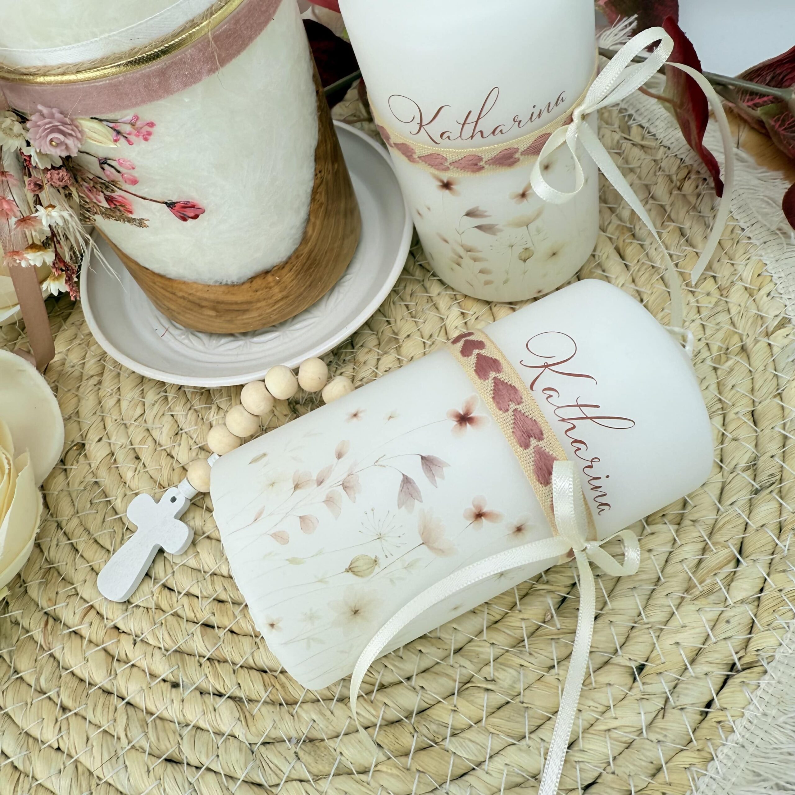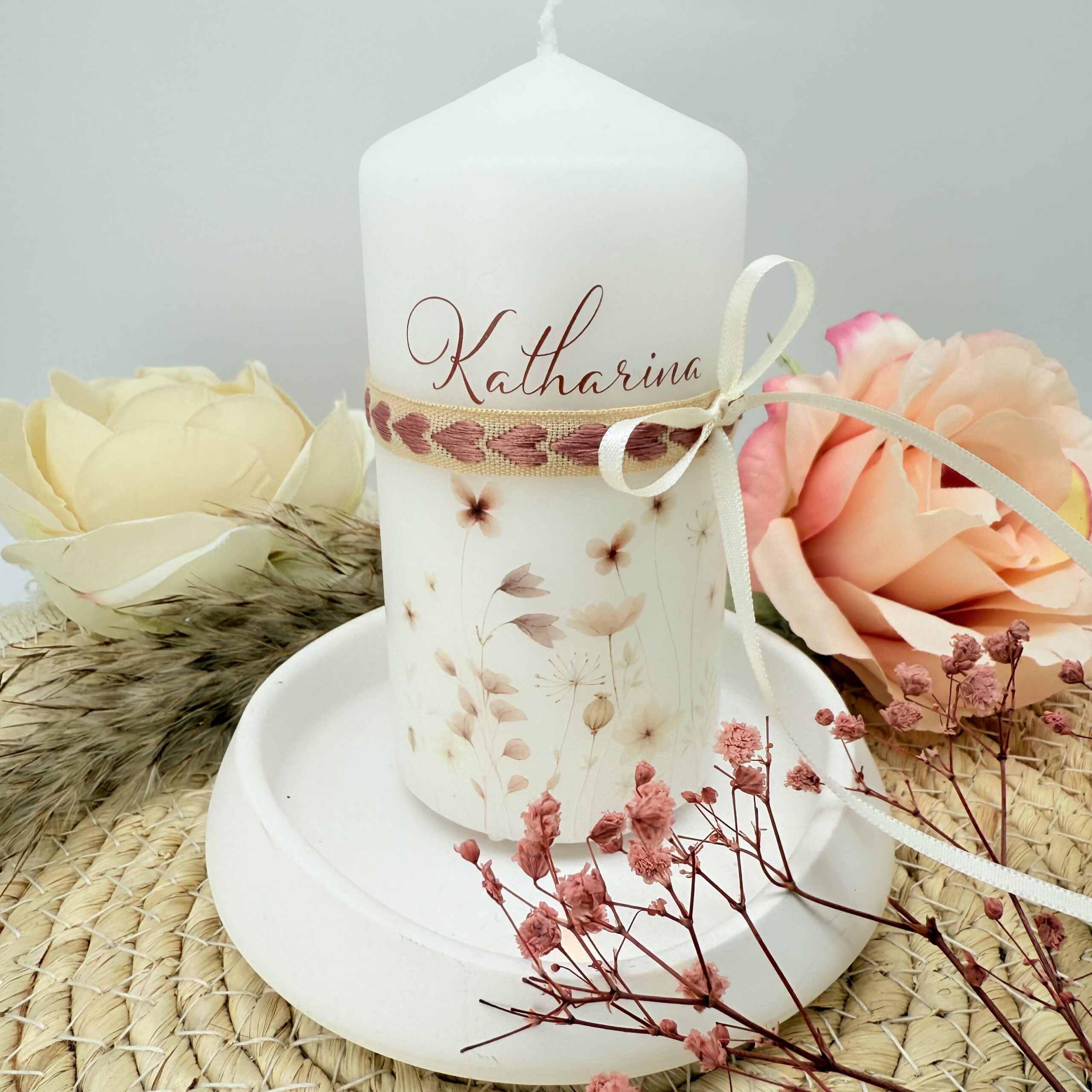 Die Gastgeschenke „Blumenwiese“ mit einem bezaubernden Arrangement aus Blumen in den Farben Altrosa und Creme ist ein berührendes Geschenk zur Taufe eines geliebten Kindes. Verziert werden diese Geschenkskerzen mit Bändern. Wir behalten uns vor, dass wir euch eine andere Bänderauswahl zuschicken, falls das Herzchenband am Foto ausverkauft ist.