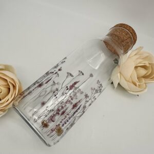 Schicke 1 Liter-Glaskaraffe bedruckt mit einem handgemalten Wiesenblumen-Motiv in zarten Rot- und Naturtönen.