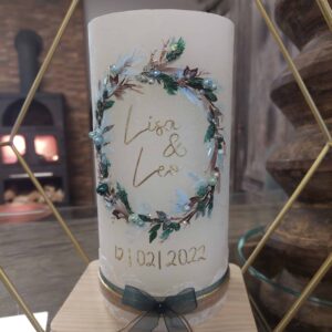 Diese Kerze kann mit passenden Bändern veredelt werden.