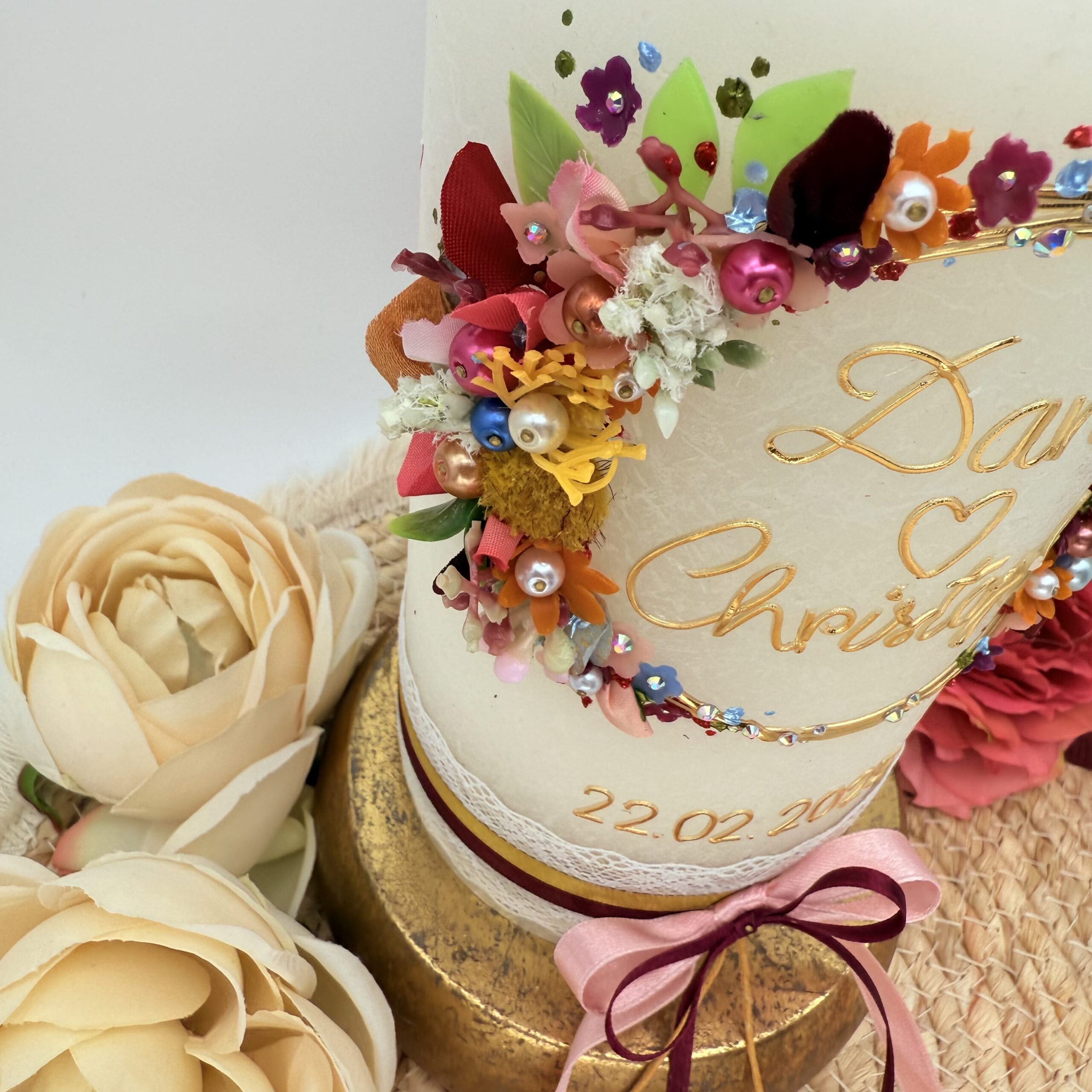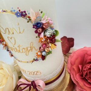 Der wunderschöne und besonders aufwendig gestaltete Flowerloop auf dieser Hochzeitskerze besticht durch die präzise Anordnung der Kunst- und Wachsblüten. Mit Perlen, Strass und handgemalten Elementen wirkt das Blütenarrangement lebendig und fröhlich. Passende Bänder unten vollenden dieses Kerzenmeisterwerk. Handwerkskunst in höchster Qualität.