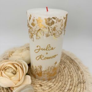 Diese Hochzeitskerze besticht durch die besondere Anordnung der Verzierung. Echtes Blattgold und daraus verlaufende Blätter und Blüten aus feinen Goldstreifen erzeugen eine strahlende Eleganz.