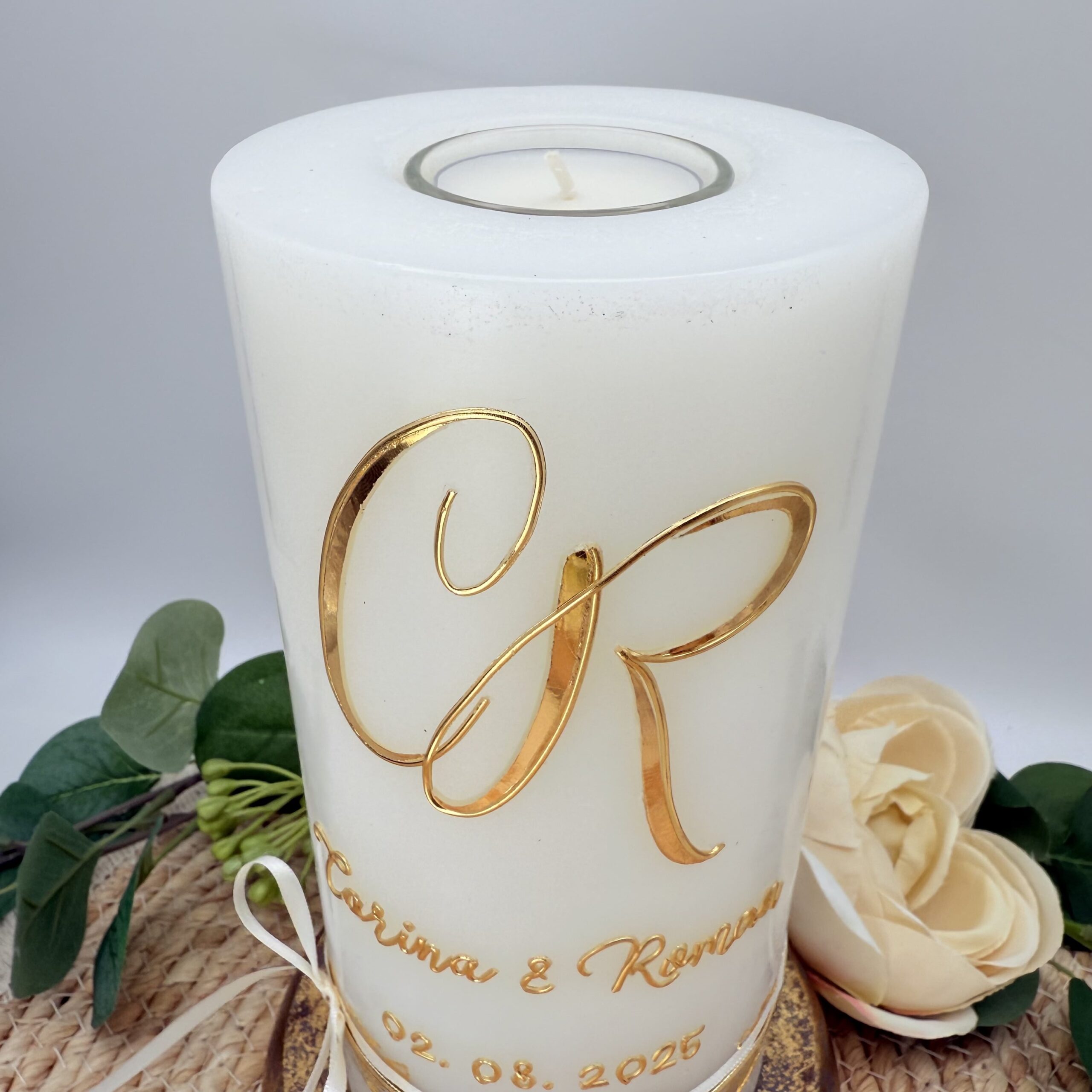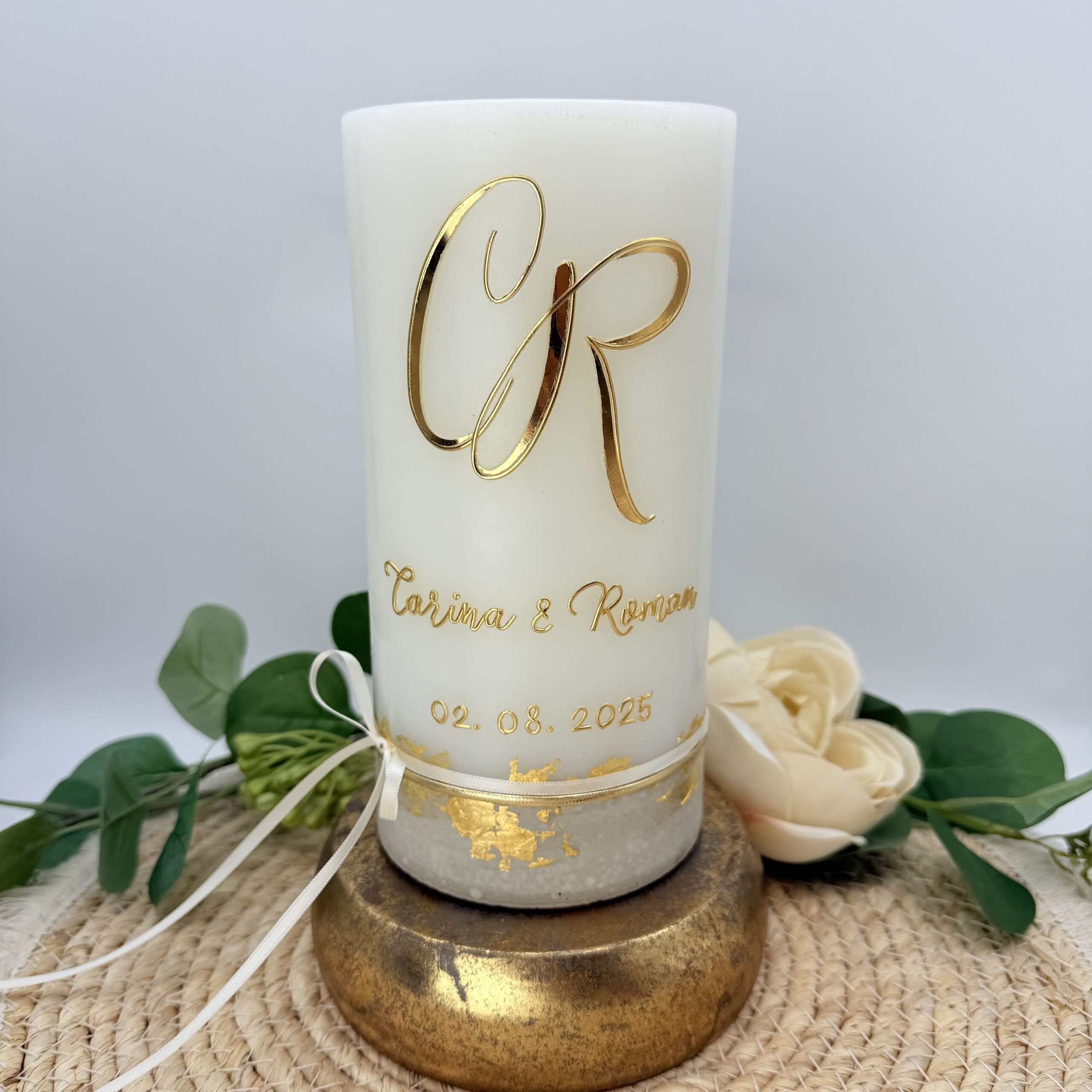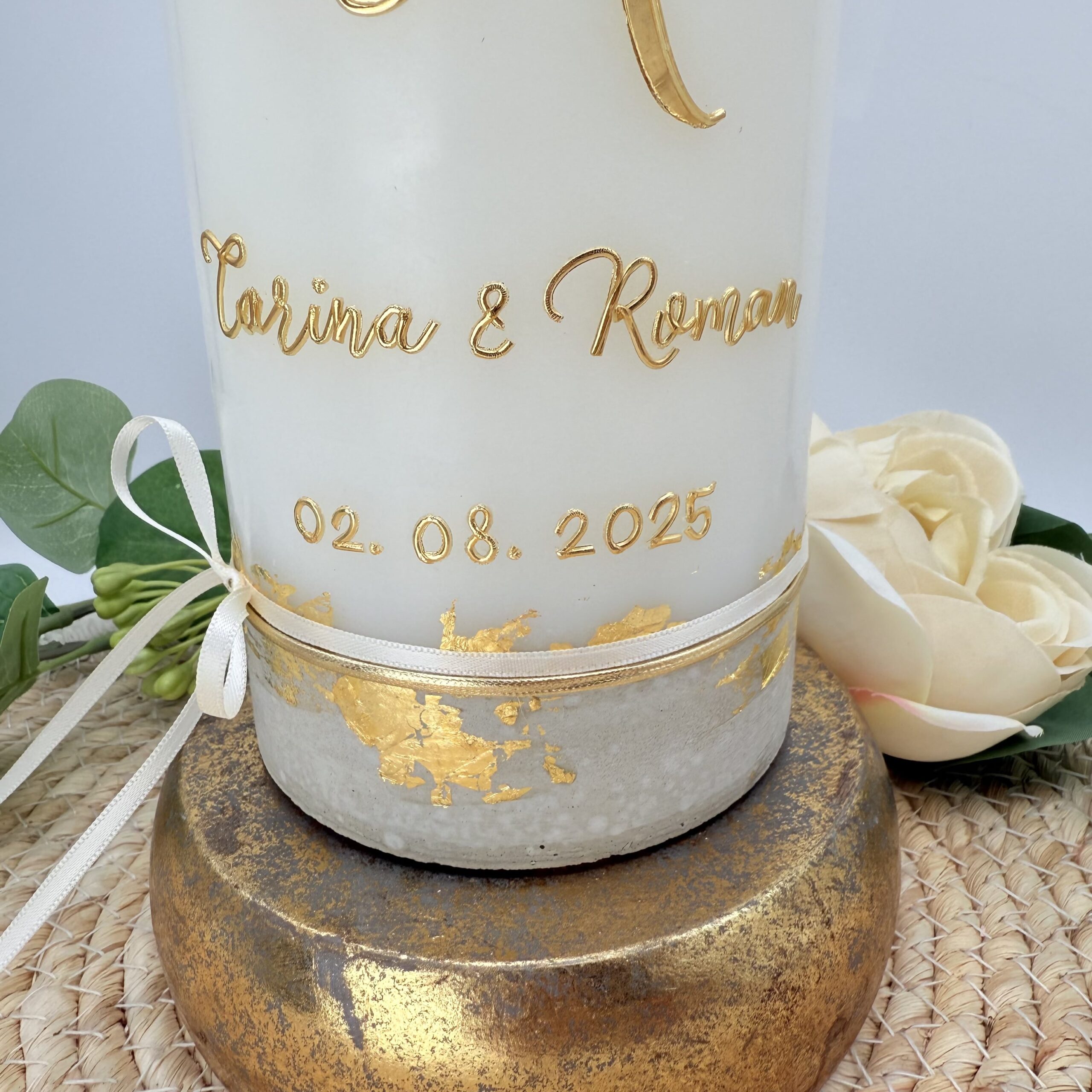 Hochzeitskerze „Golden Monogram“ mit Betonsockel
