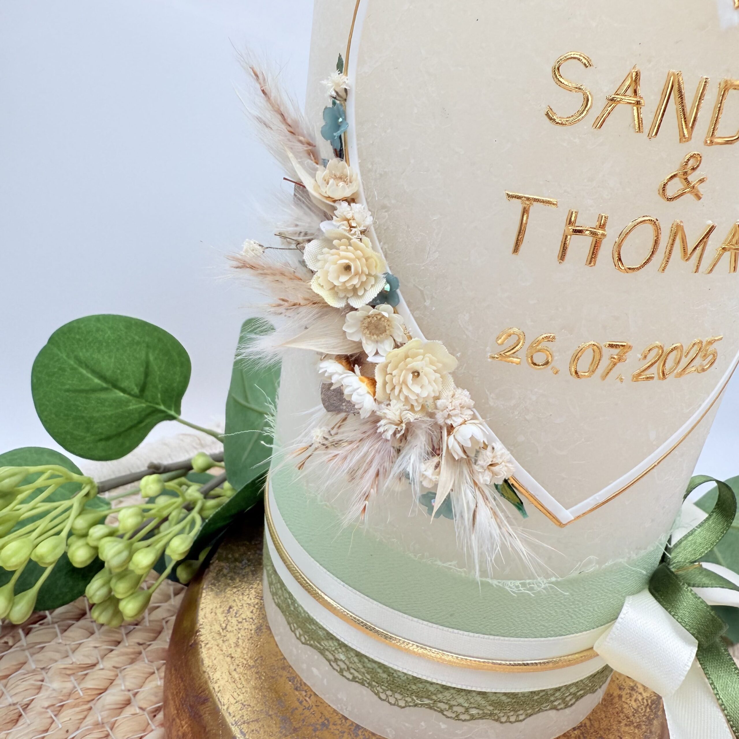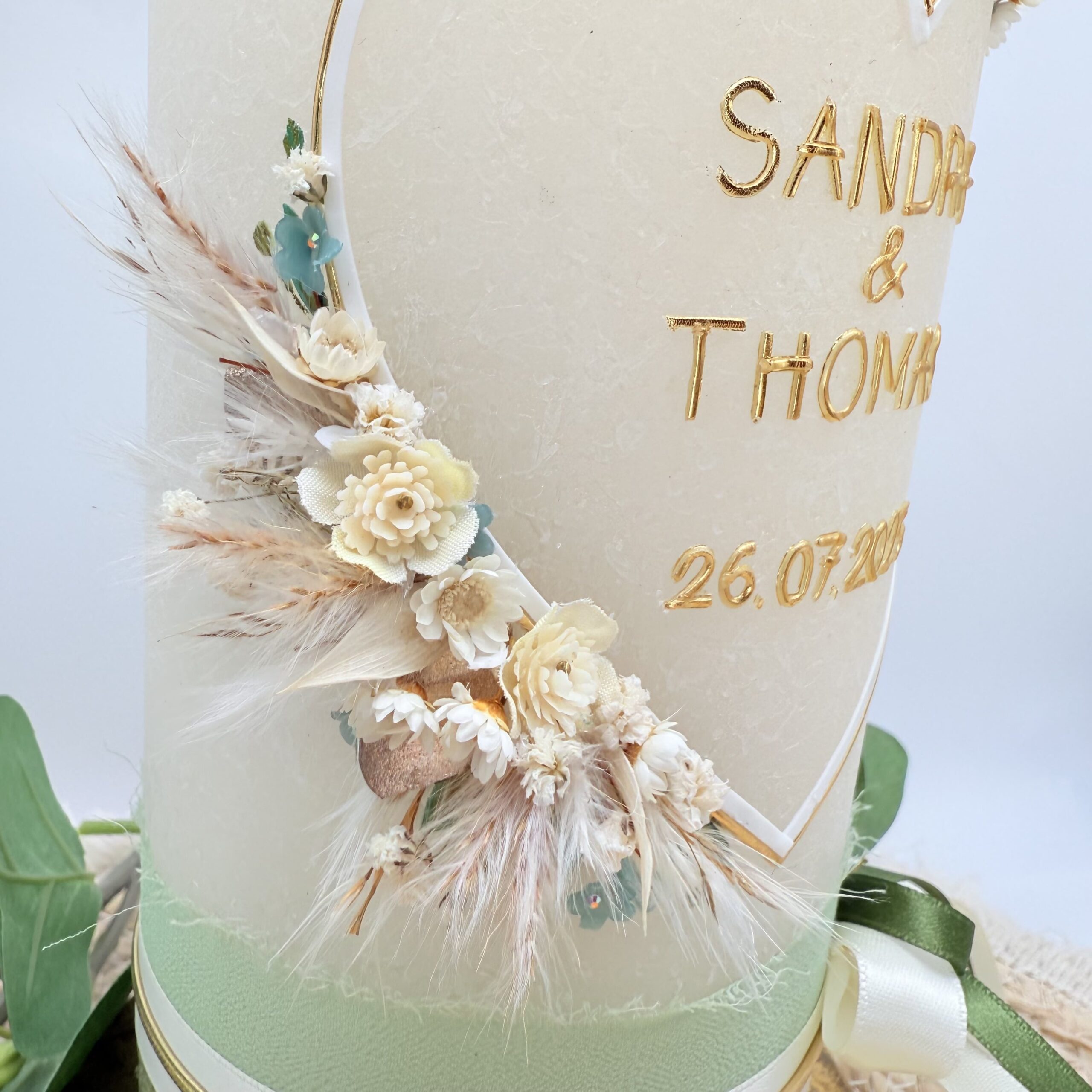 Diese Hochzeitskerze wird von einem Herz verziert, das mit Wachsblüten und echten Trockenblumen umspielt wird. Die Wachselemente im Hintergrund sind zusätzlich per Hand in mehreren Schichten übermalt, damit der Watercolour-Effekt entsteht.