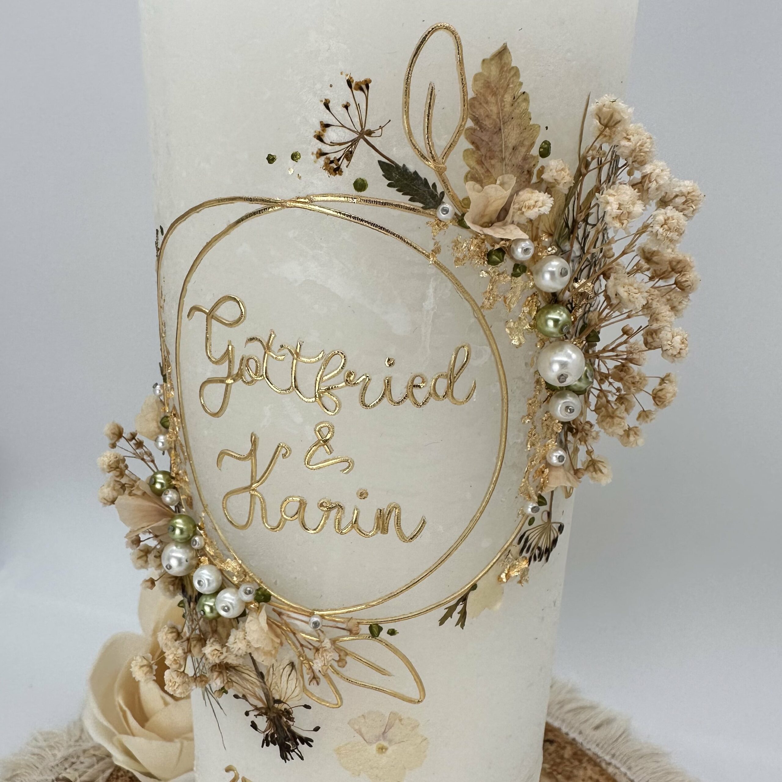 Diese unglaubliche Hochzeitskerze besticht durch ihre natürlichen Farben und ist etwas ganz Besonderes. Verwendet werden ausschließlich echte getrocknete Blüten und Blätter. Handverlesen werden sie auf die Kerze drapiert, mit Perlen und echtem Blattgold verziert, so findet man immer wieder neue Details im Motiv.