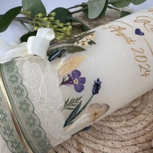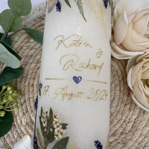Rustik-Kerze in der Farbe „Soft Pearl“ verziert mit echten Trockenblumen & -blättern! Liebevoll oben und unten angeordnet bilden sie einen Rahmen um die Namen des Brautpaares. Außerdem zieren dieses Motiv Blätter und Lavendelblüten aus Wachs, die per Hand übermalt werden und Pampasgras, das von der Kerze absteht. Alles zusammen gibt der Kerze eine einzigartige Optik.