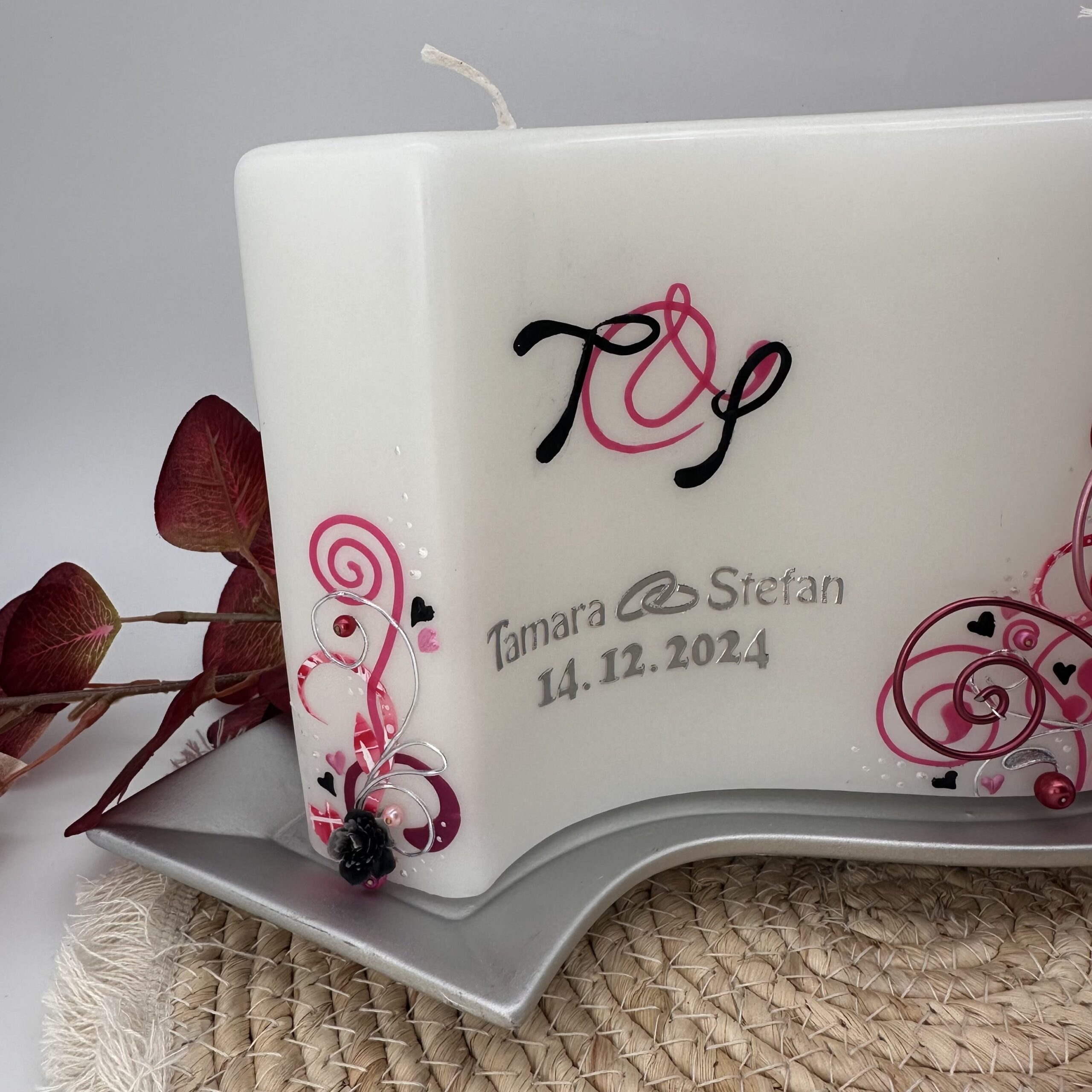 Zeitlos, elegant und trotzdem aufwendig im Design. Ein Blättermotiv, Schnörkel aus Draht, Perlen & Holzherzen lassen das Motiv dreidimensional wirken. Außerdem hat diese Kerze eine Perlmutt-Strukturoberfläche, die wunderschön schimmert.