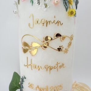 Wunderschöne Hochzeitskerze aus Stearin mit eingegossenem Holzelement. Es gibt die Kerze mit Docht oder mit Teelicht-Einsatz. Verziert wird diese Kerze von Wiesenblumen, die von oben und von unten die Kerze entlang wachsen. Zarte Blüten aus Wachs in Rosa und Weiß und getrocknete Blüten in Gelb lassen die Kerze lebendig wirken. Die Blätter und Blütenstängel sind zusätzlich per Hand mehrschichtig übermalt werden, um den beliebten Watercolour-Effekt zu erzielen. Die Namen stehen im Mittelpunkt und sind aus goldenen Wachsstreifen gestaltet – farblich perfekt passend zum Holzelement. Das Besondere an dieser Kerze ist das Infinity-Zeichen, das mit Fuß- und Pfotenabdrücken umspielt wird. Auf dieser Kerze stehen sie für die zwei Elternteile, zwei Kinder und zwei Hunde und sollen die Familie darstellen. Die Anzahl der Abdrücke kannst du selber aussuchen und so individuell an deine Familie anpassen