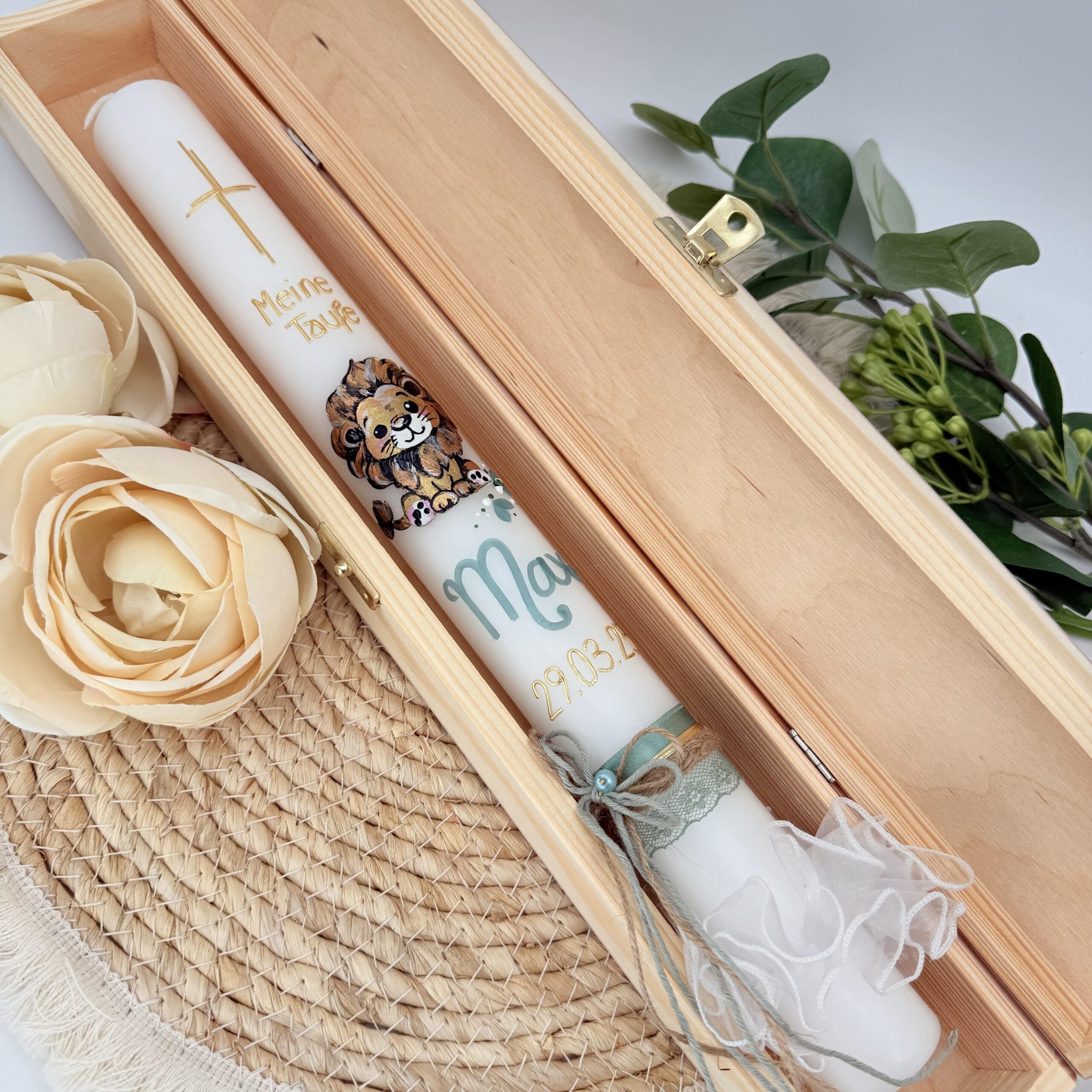 Wunderschöne Holzbox für die Taufkerze oder Aufbewahrungsbox für kleine Andenken an die Taufe. Falls ihr euch für die bedruckte Variante entscheidet, kreieren wir ein passendes Motiv zu deiner Taufkerze.