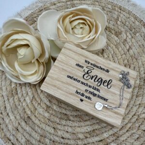 Dieses bezaubernde Schmuckkästchen ist nicht nur ein praktisches Aufbewahrungsstück, sondern auch ein kleines Kunstwerk, das liebevolle Erinnerungen bewahrt. Es eignet sich besonders gut als Verpackung für das Taufkettchen, das ihr dem Taufkind als Geschenk zur Taufe übergebt. Es wird vom Spruch „Wir wünschen dir einen Engel und sei er noch so klein, er möge immer bei dir sein“ geschmückt.