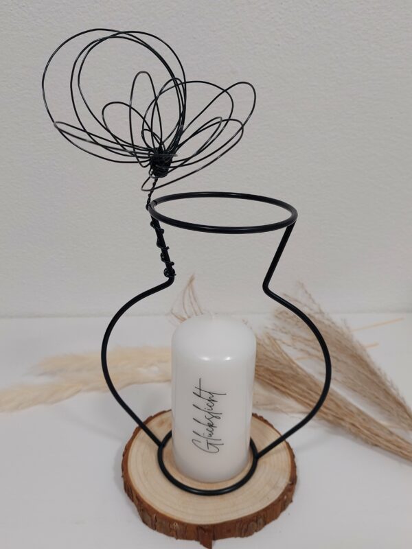 Silhouette-Vase mit handgearbeiteter Drahtblume auf einer Holzscheibe.