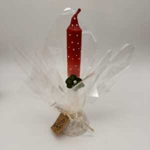 Die bezaubernde Tafelkerze, die wir hier präsentieren, ist ein hübsches Mitbringsel für deine Liebsten oder als Deko für deine Festtafel ein echter Hingucker. Mit einer Länge von 19 cm strahlt diese Kerze eine warme, einladende Atmosphäre aus und fängt alle Blicke ein. Ihr Äußeres ist ein Kunstwerk für sich: Die weißen Tafelkerzen werden per Hand mehrmals in rotes Wachs getaucht und bekommen dann durch die weißen Punkte die Optik eines Fliegenpilzes. Außerdem ist die Kerze fertig in Cellophan verpackt und das Set beinhaltet natürlich auch den Kerzenständer in Form eines kleinen Guglhupfs.
