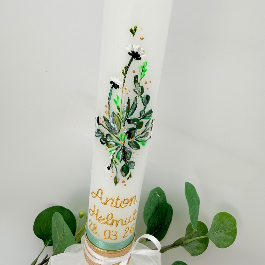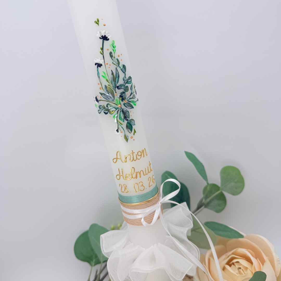 Sehr trendige und elegante Taufkerze mit einem zarten, Kreuz, das von Blättern und Blümchen umspielt wird. Verschiedene Bänder in unten runden dieses Motiv ab. Die Blätter sind aus Wachs gestaltet und zusätzlich per Hand übermalt, um den Watercolour-Effekt zu erzielen.