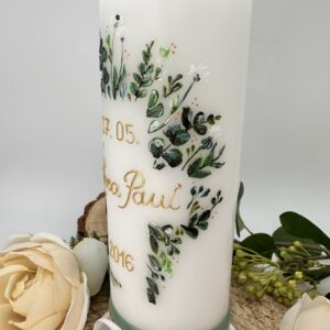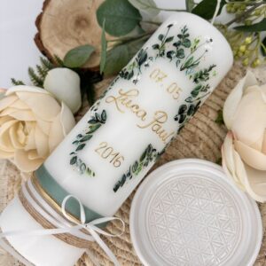 Außerdem kannst du die perfekt dazu passende Kommunionskerze für die Erstkommunion deines Lieblings gleich hier mitbestellen. Und natürlich können wir auch farblich passende Gastgeschenkskerzen für dich gestalten.