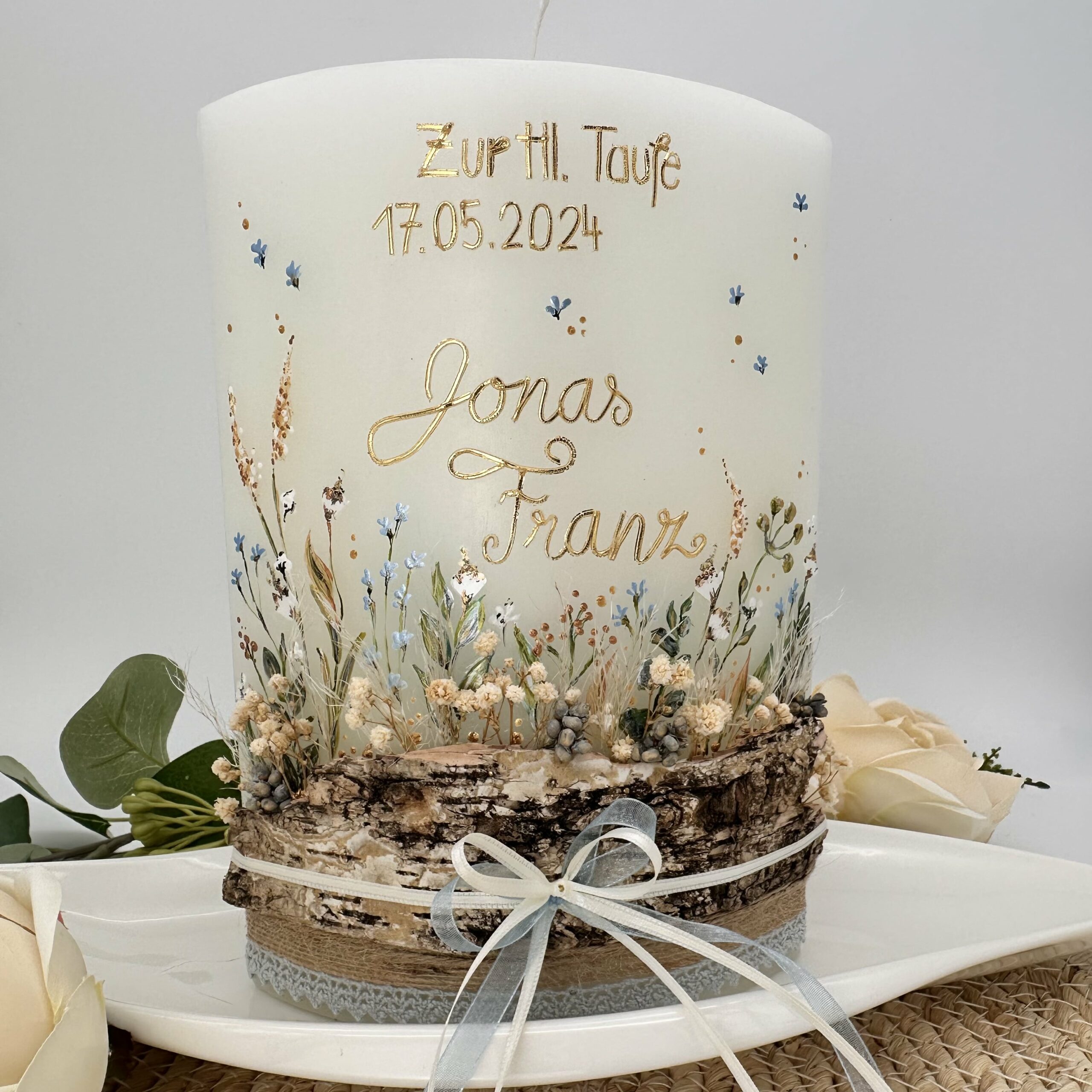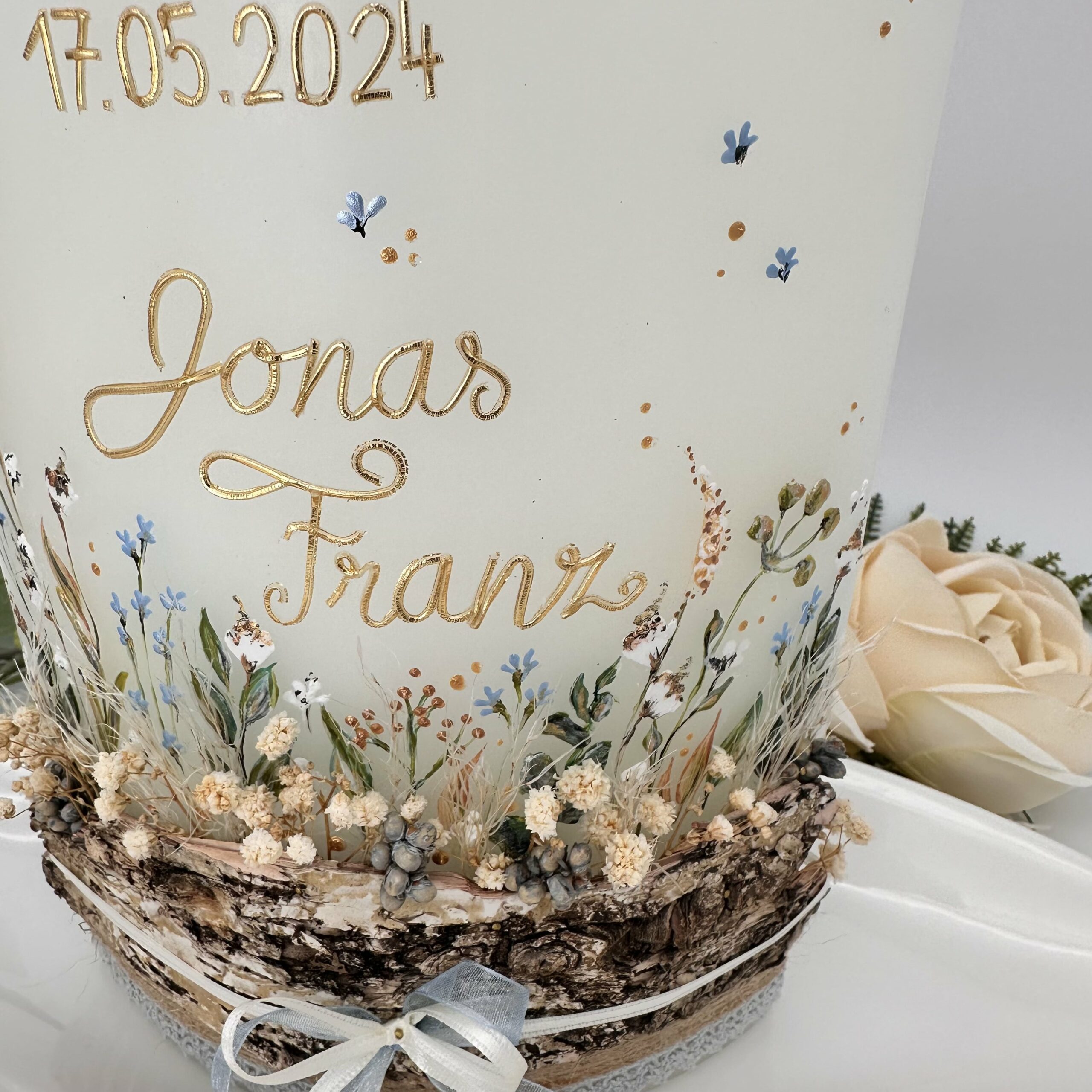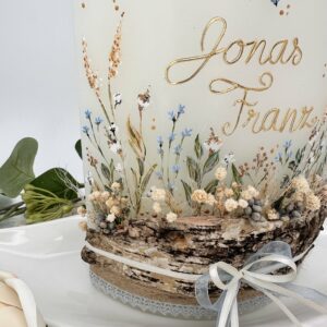 Diese wunderbare, sehr besondere Taufkerze wird verziert von einer handgemalten Blumenwiese mit Wachselementen und echtem getrockneten Schleierkraut. Das Holzelement ist so angeordnet, dass die Blumen aus ihm hervorsprießen. Die passenden Bänder und die Baumrinde unten runden das Gesamtbild ab.