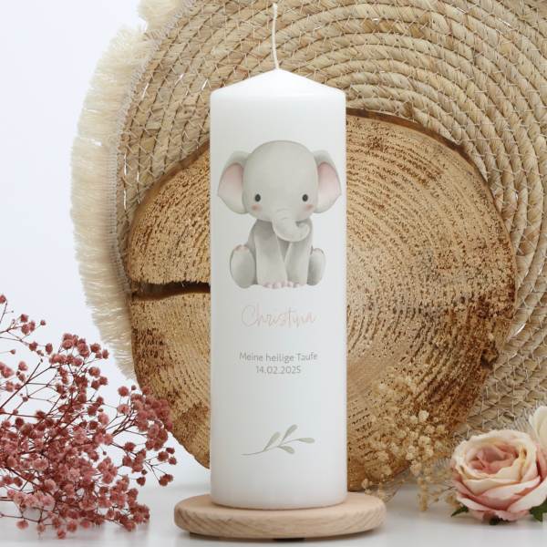 Süße Taufkerze mit einem Elefanten und floralem Element.