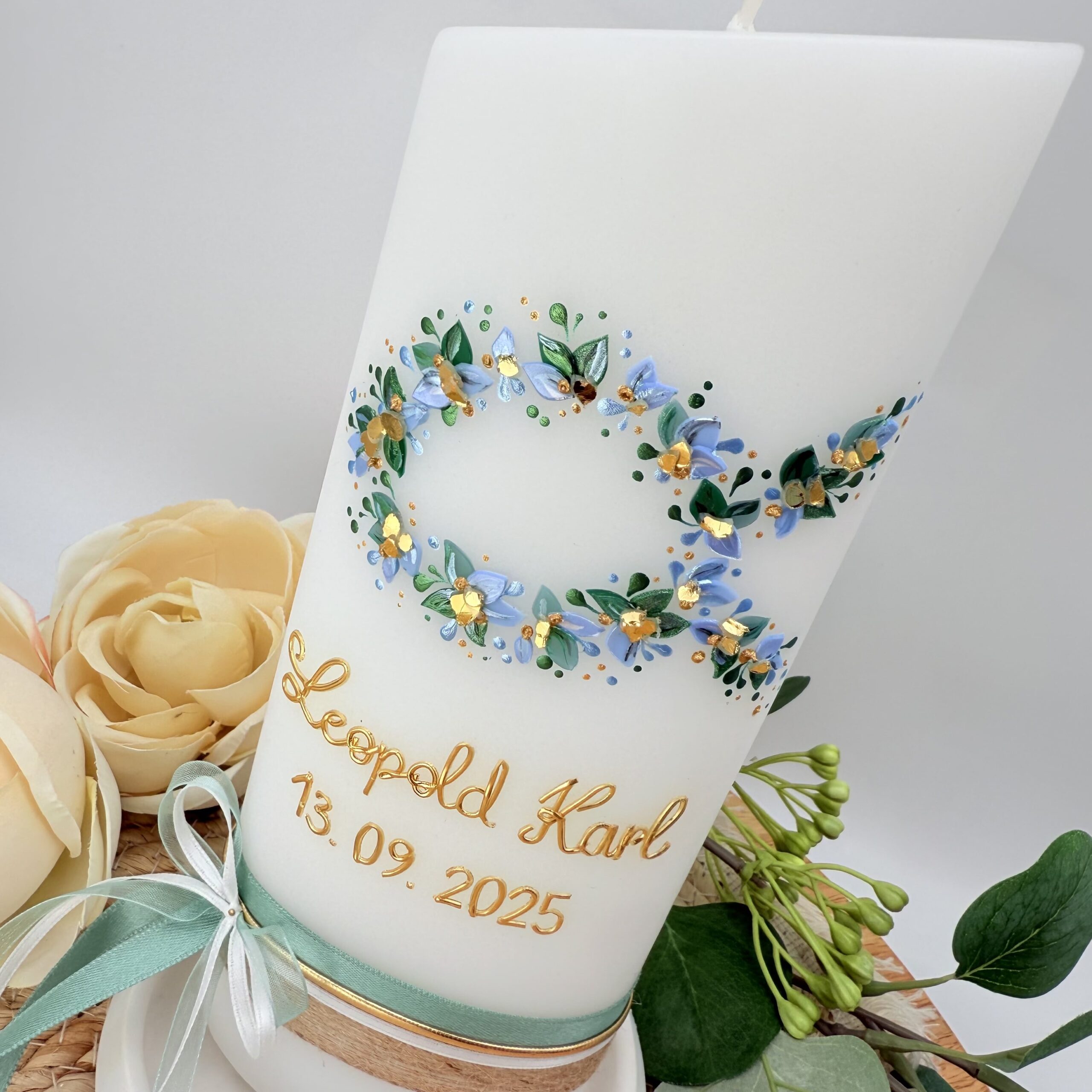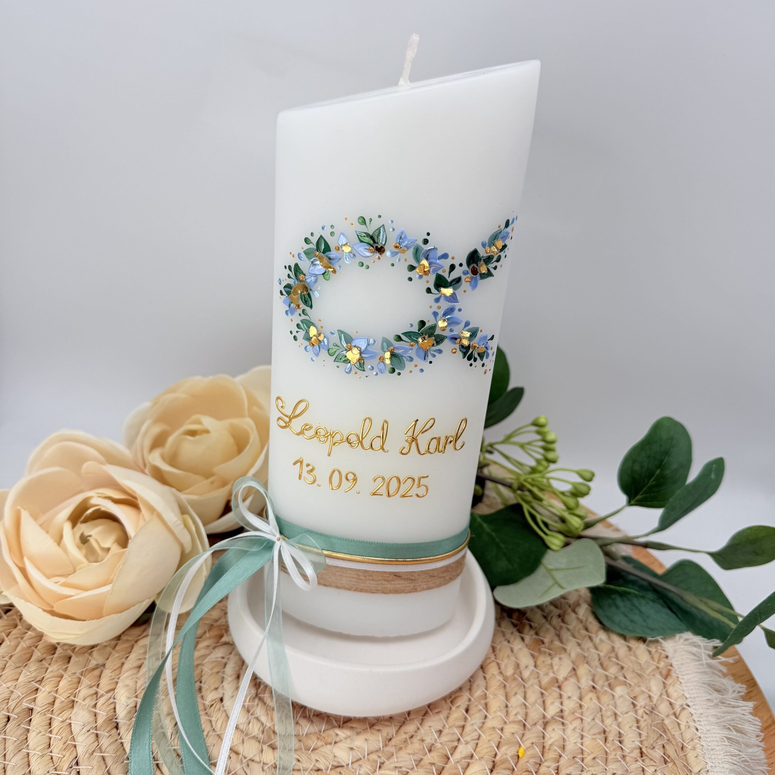 Watercolour-Look zu erzeugen. Goldelemente, Satinband und Jute veredeln diese elegante Taufkerze.