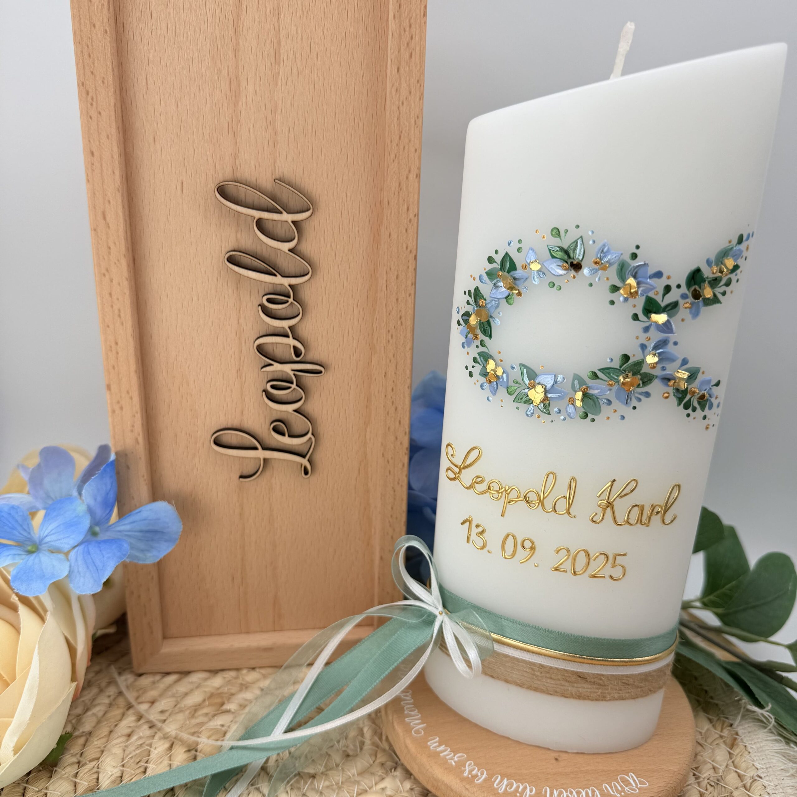 Außerdem gibt es Gastgeschenke und eine Kommunionskerze, die perfekt zum Design passen! Die Holzbox mit dem gefrästen Namen findest du in der Rubrik „Kerzenverpackung“.