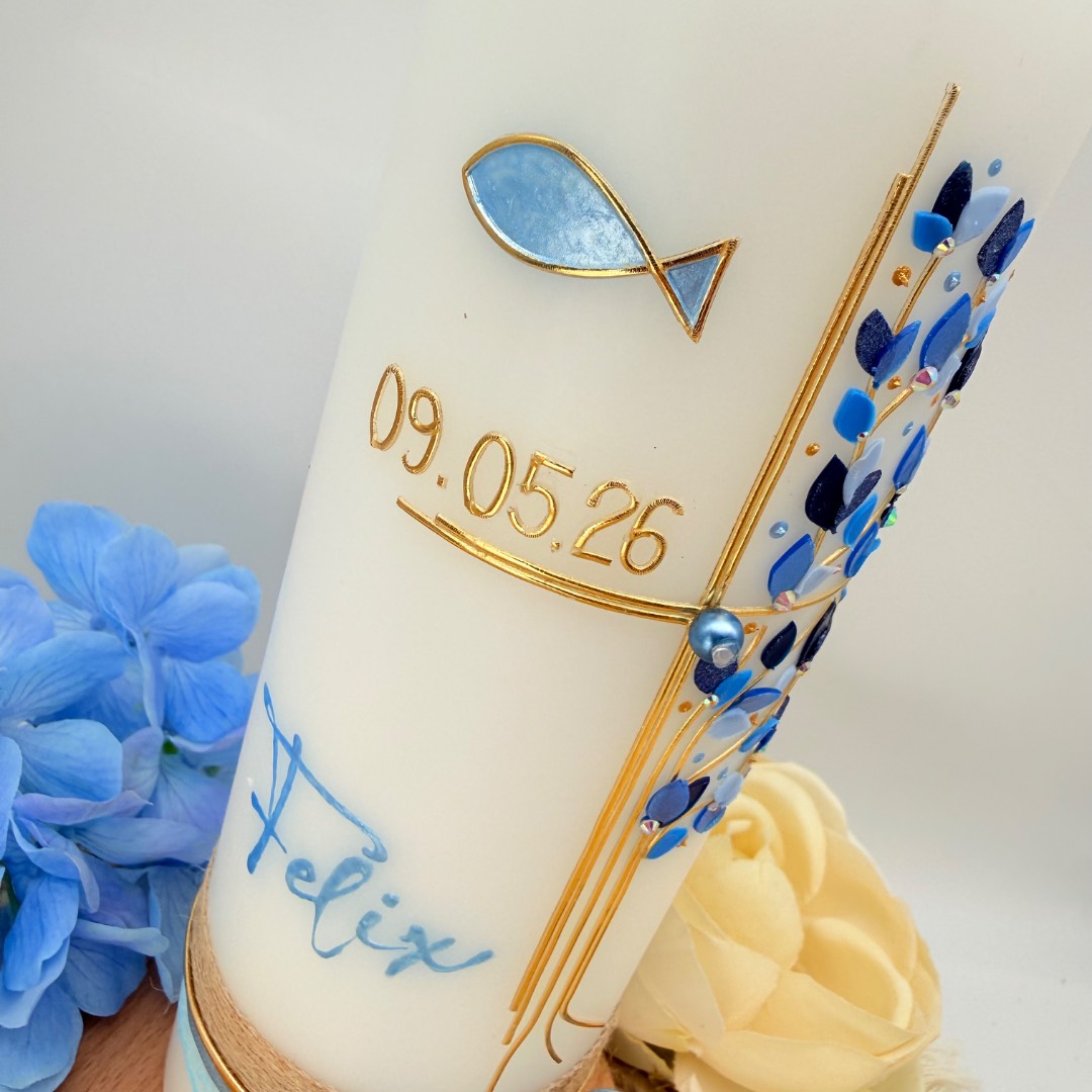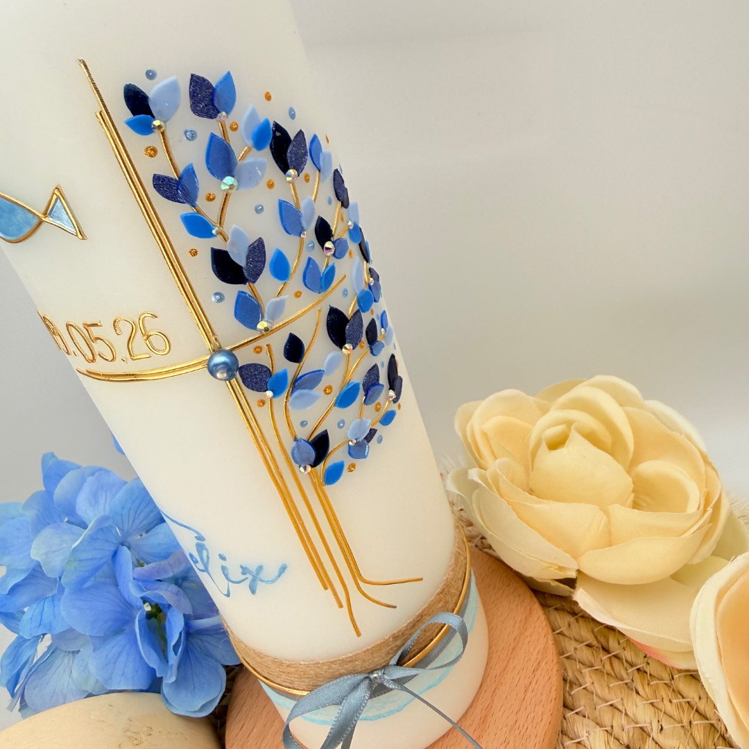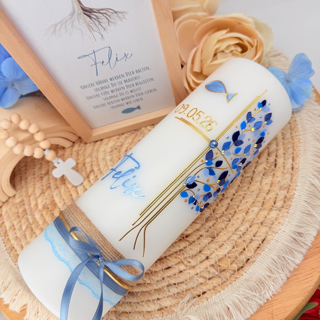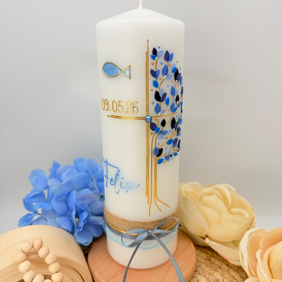 Taufkerze „Lebensbaum“ mit Kreuz und Fisch blau