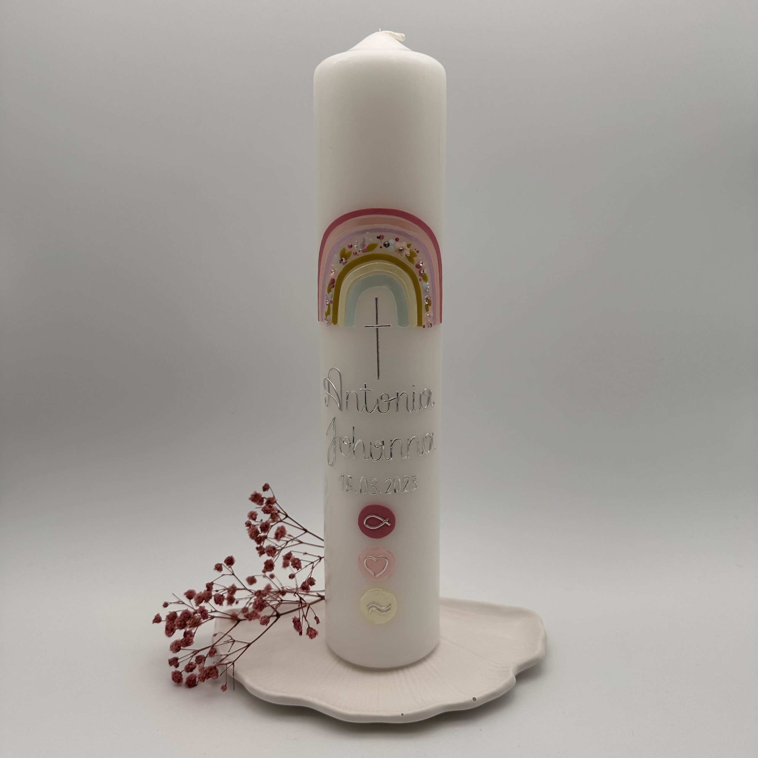 Supersüße Taufkerze mit einem Regenbogen und eigearbeiteten Blütenkränzchen.