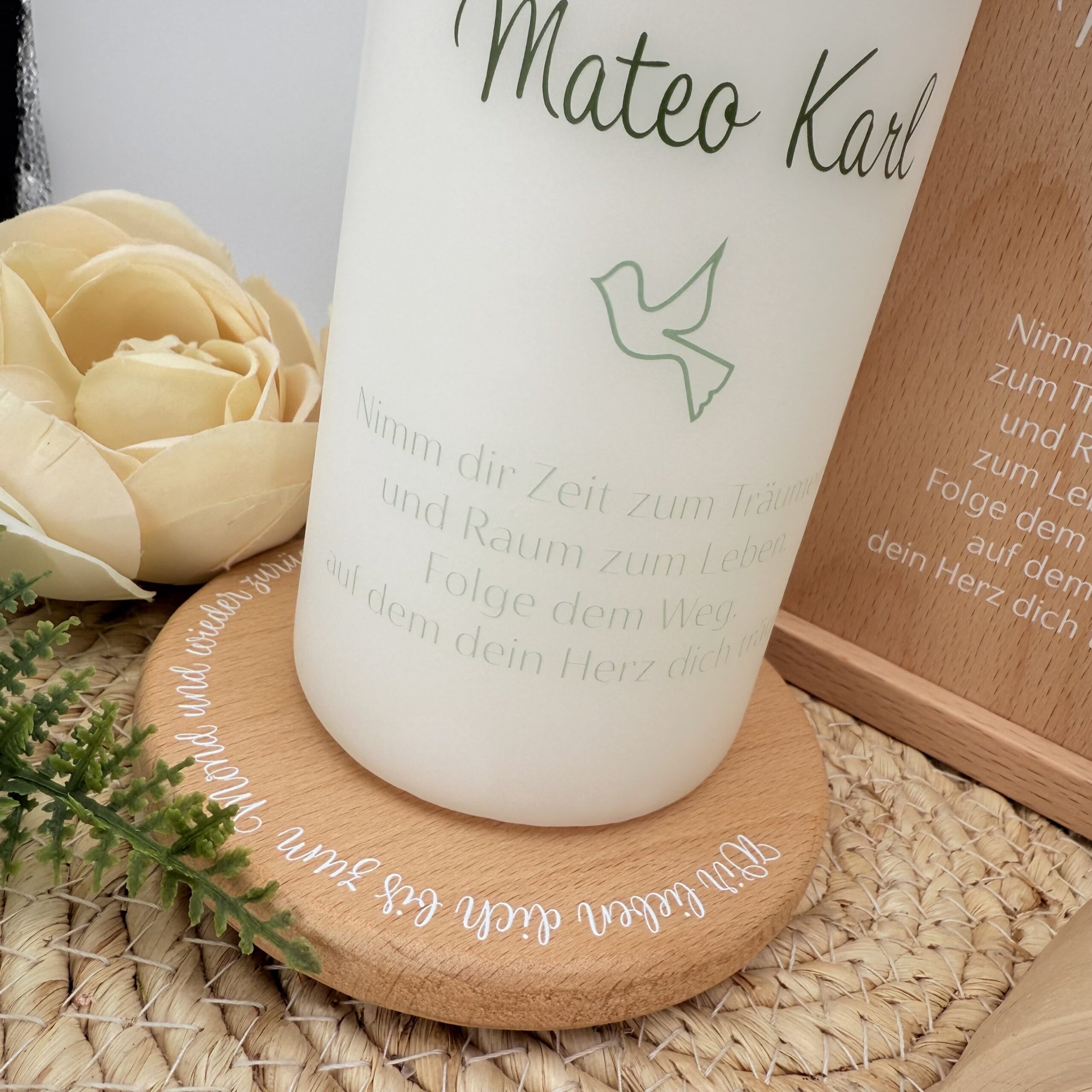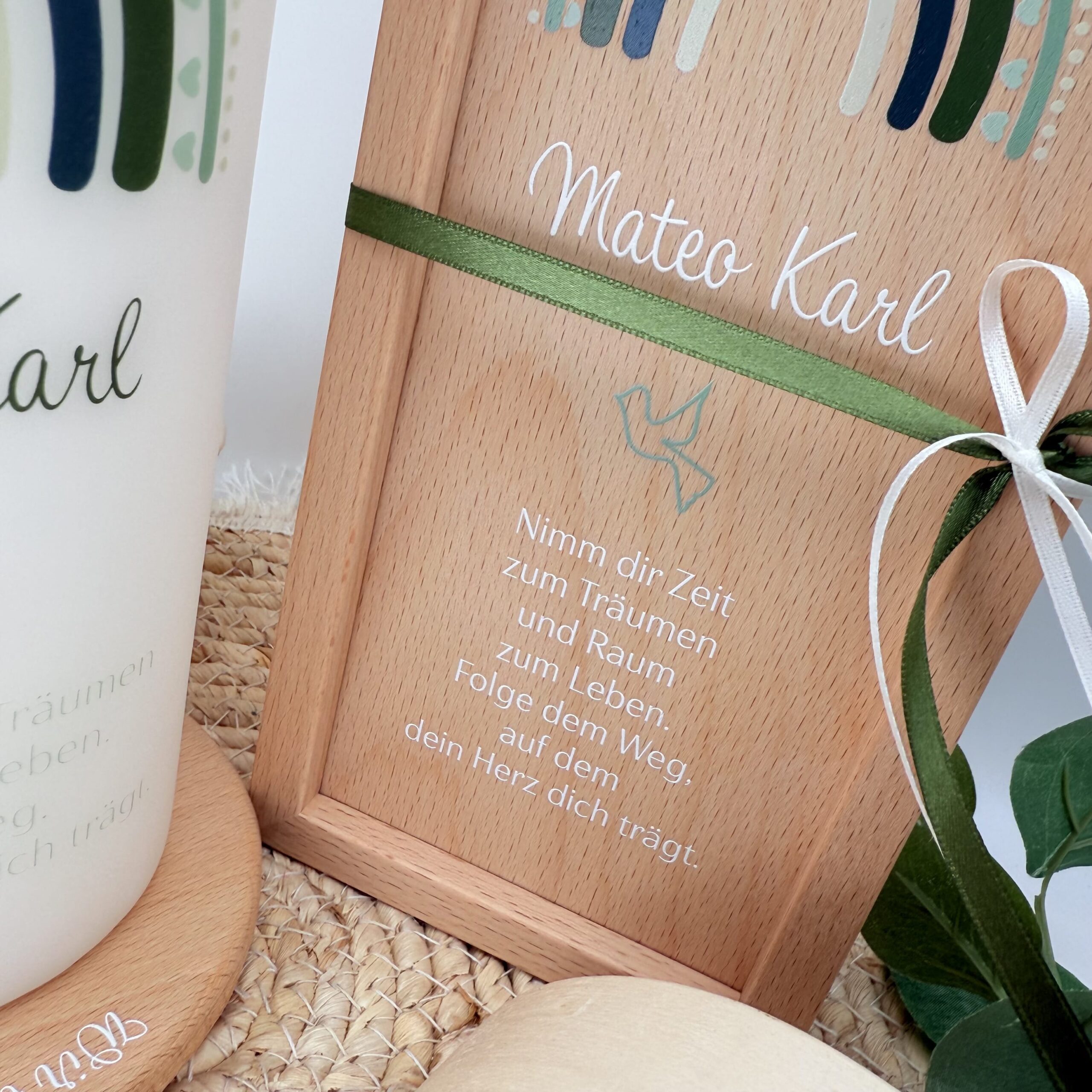 Wunderschöne, massiv gefertigte Holzbox für die Taufkerze oder Aufbewahrungsbox für kleine Andenken an die Taufe. Die Box gibt es in zwei Ausführungen: Entweder “Natur” – Buche massiv – oder mit dem Motiv passend zur Taufkerze bedruckt.