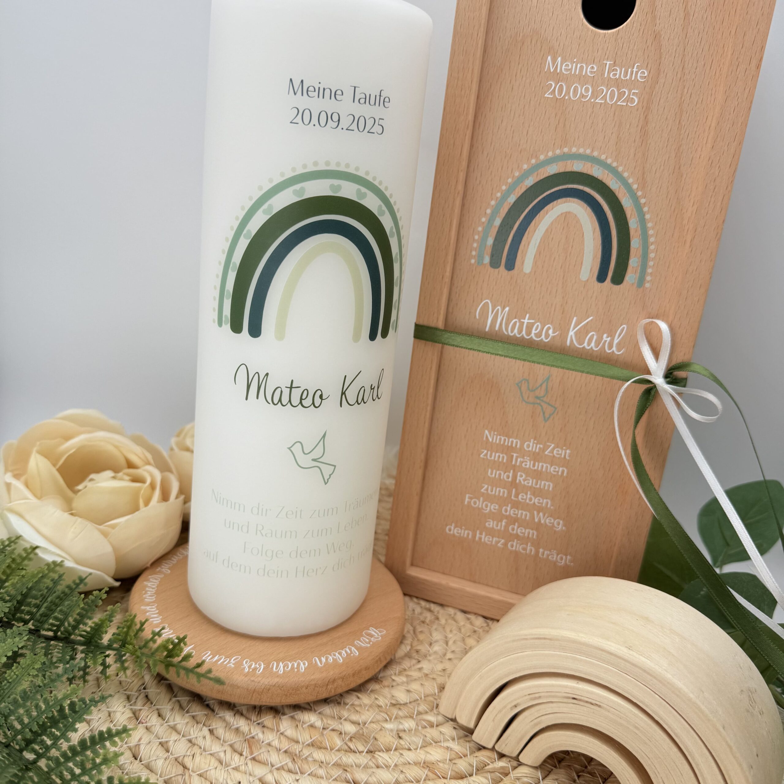 Diese Taufkerze “Regenbogen” ist in Grüntönen gehalten.