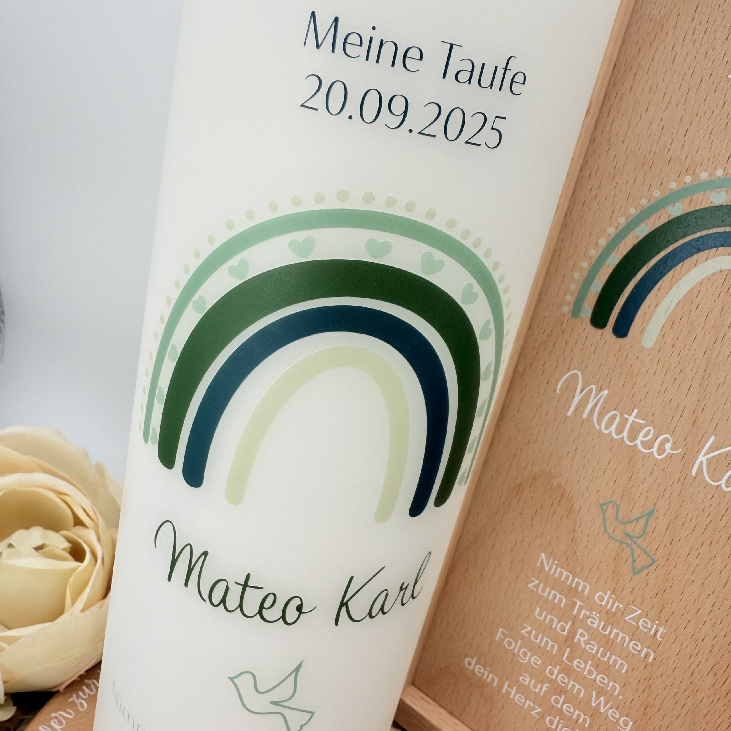 Diese liebevoll gestaltete Taufkerze vereint zarte Aquarellkunst mit natürlichen Akzenten und macht jeden Taufmoment zu etwas ganz Besonderem. Der sanfte Regenbogen steht symbolisch für Hoffnung, Schutz und Gottes Versprechen – ein wunderschönes Zeichen für einen segensreichen Neubeginn.