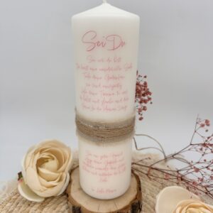 Wunderschöne Taufkerze mit echtem, getrockneten Schleierkraut in einem Altrosa-Farbton. Ein Herz aus Draht und verschiedene Jutebänder veredeln dieses Motiv.