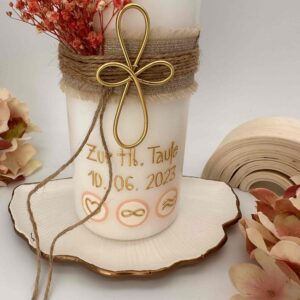 Weiters empfehlen wir zur Taufkerze „Schleierkraut“ einen passenden Kerzenteller. Ein Teller bietet eurer Kerze einen sicheren Halt, die Kerze wird toll in Szene gesetzt und Untergründe werden vor Wachsflecken geschützt.