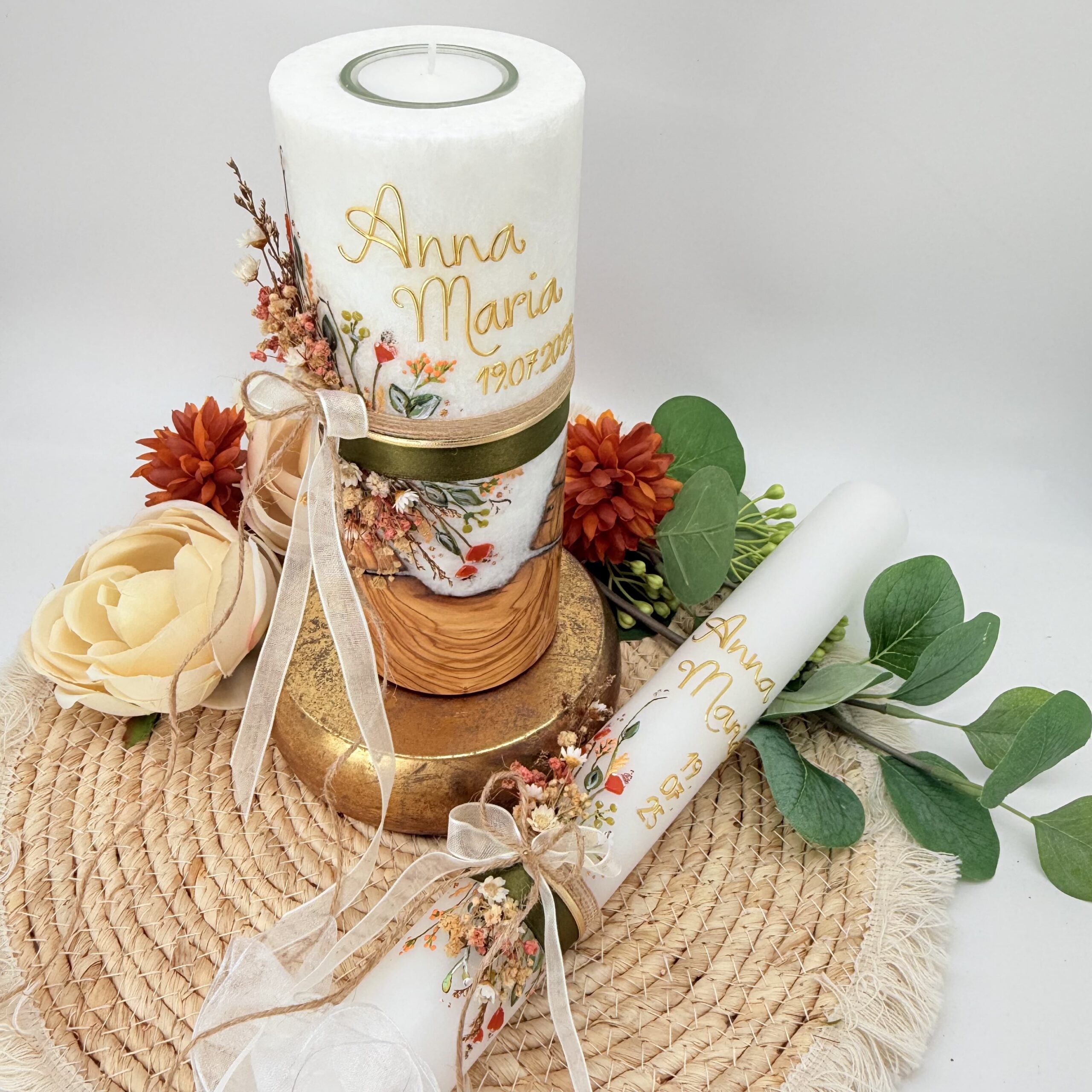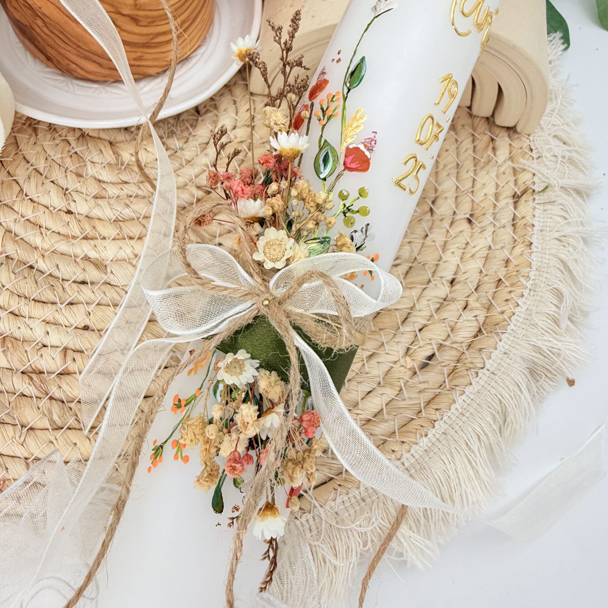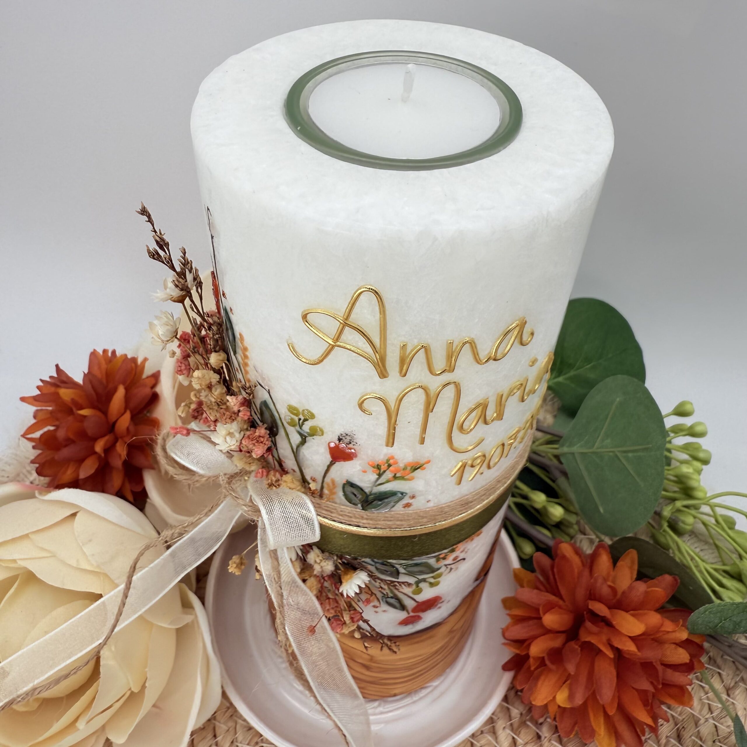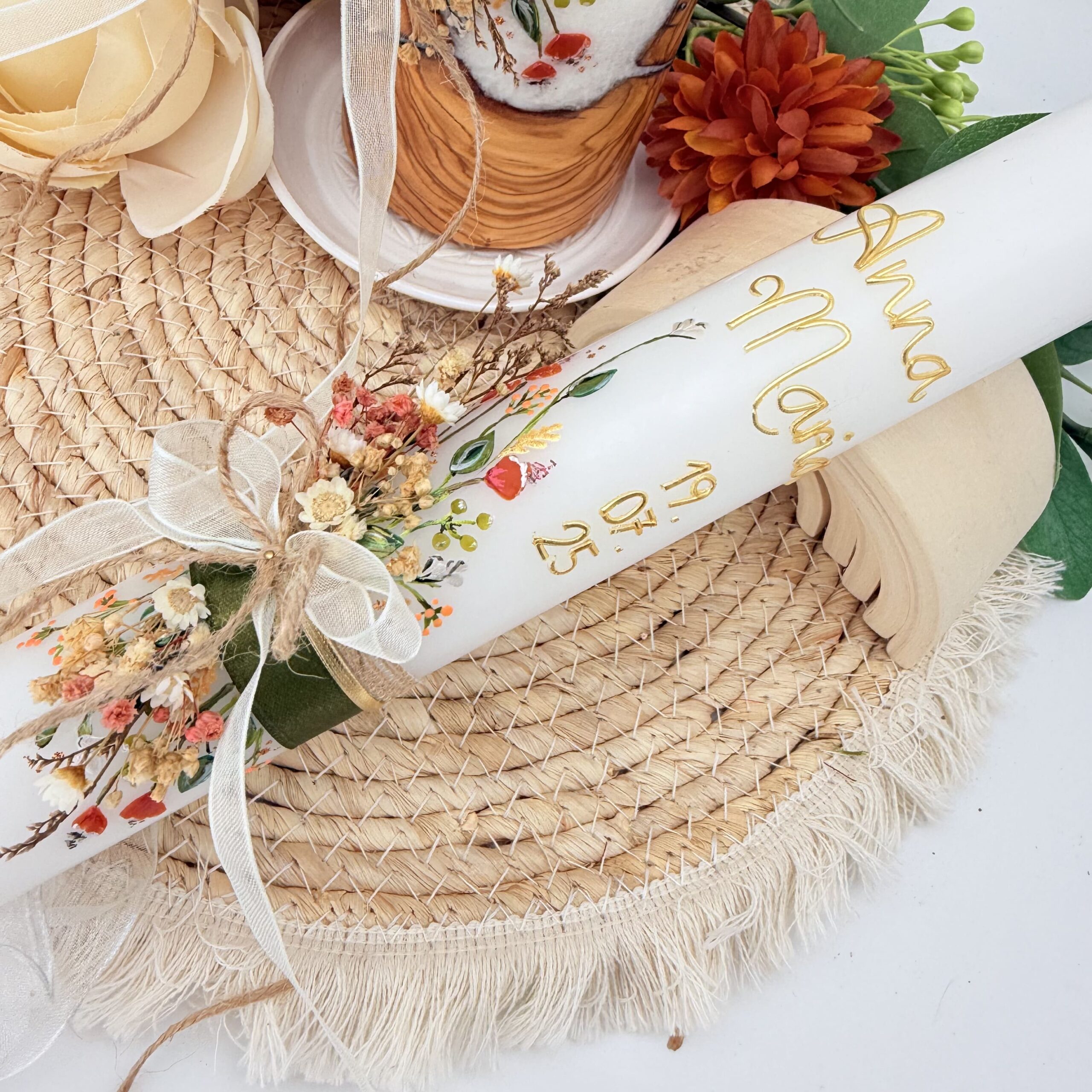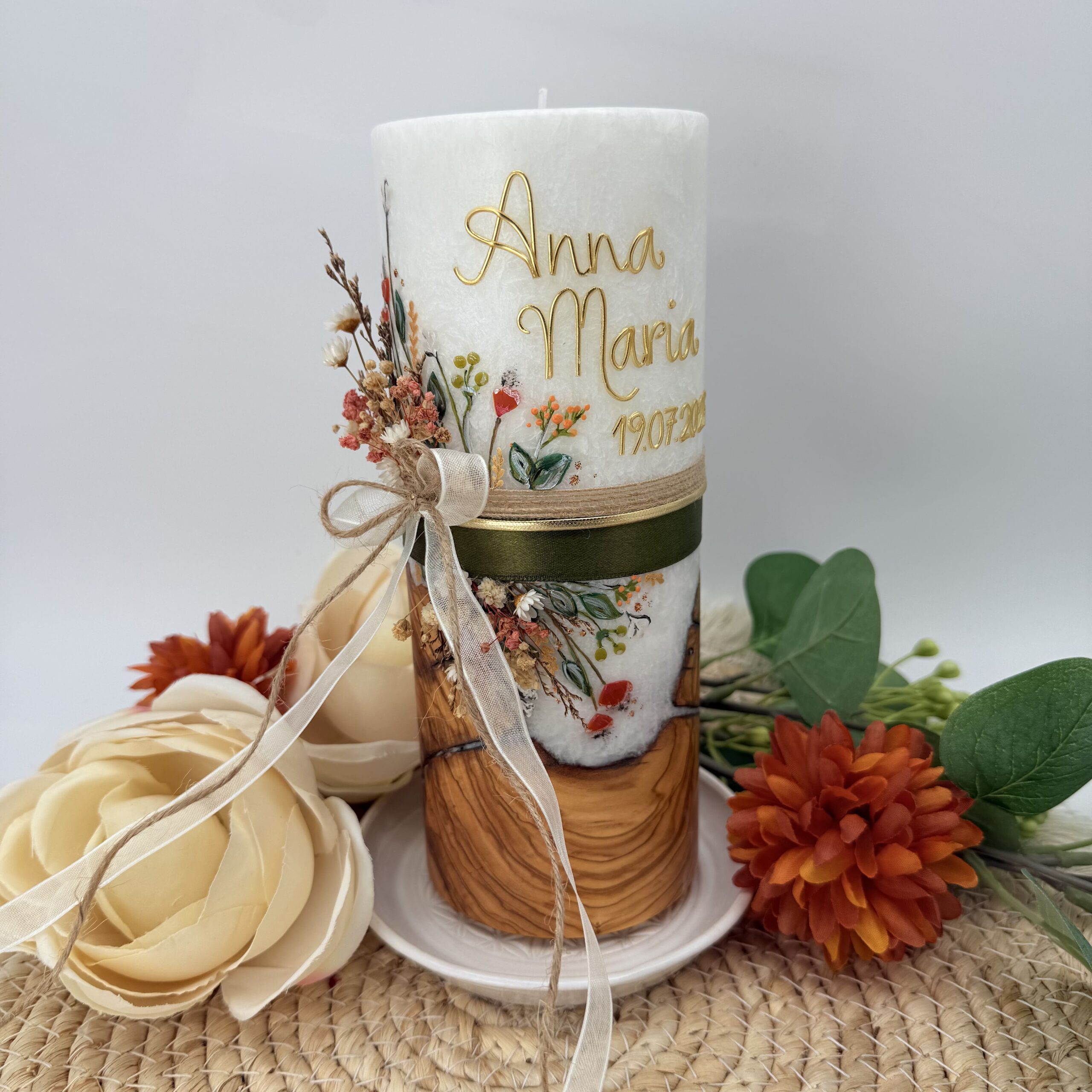 Wunderschöne Taufkerze aus Stearin mit eingegossenem Holzelement. Verziert wird diese Kerze mit verschiedenen Bändern, aus denen ein Blütenbüschel „wächst“.