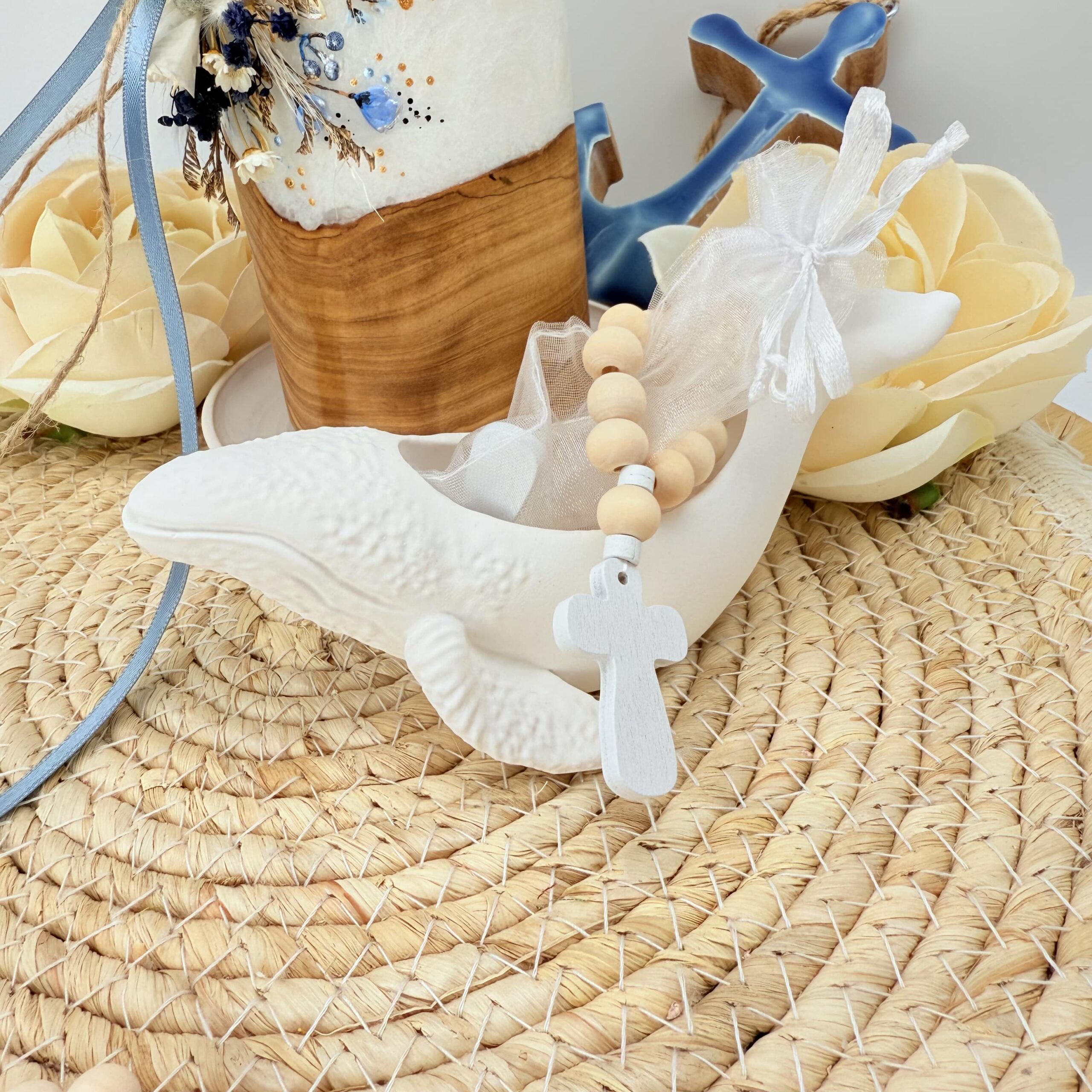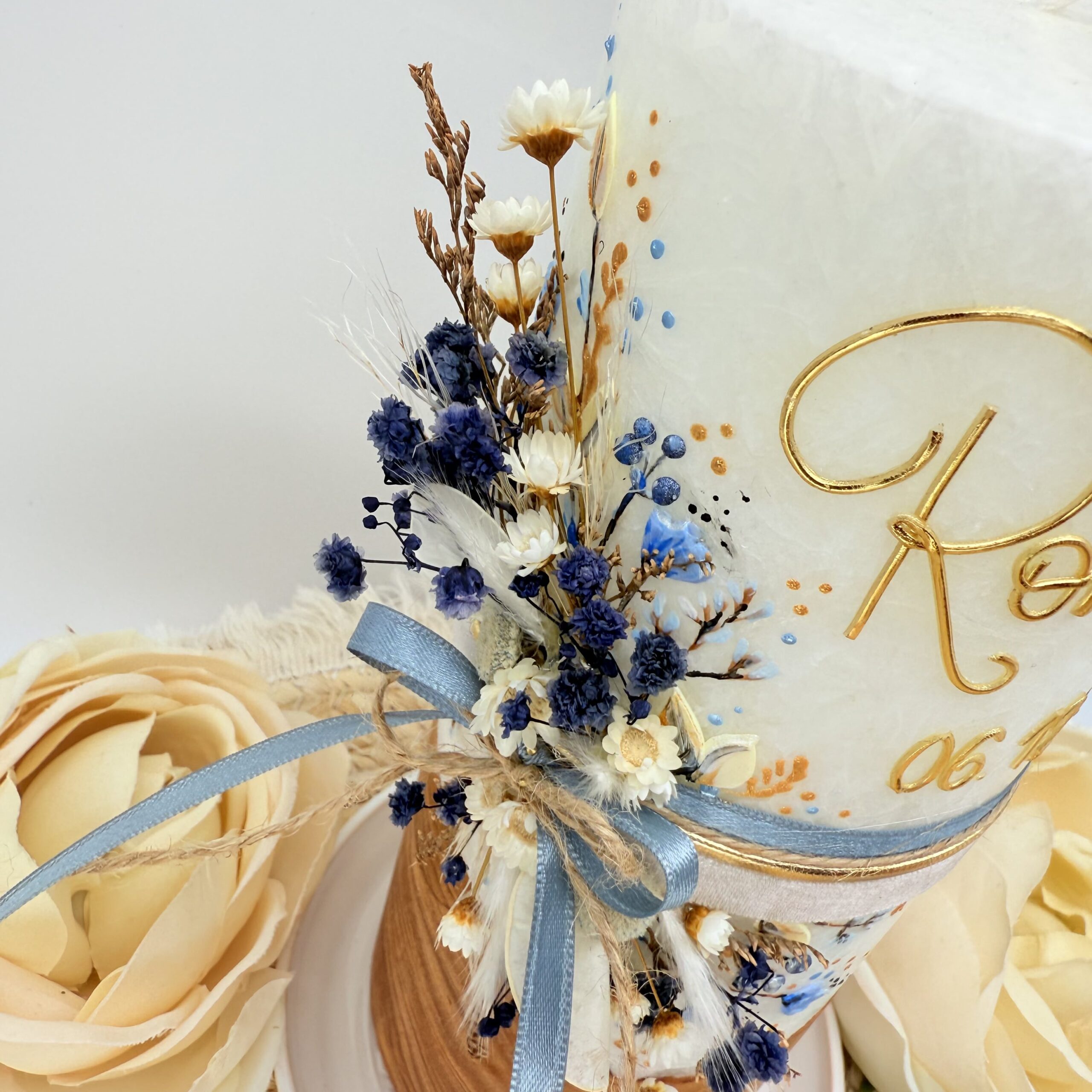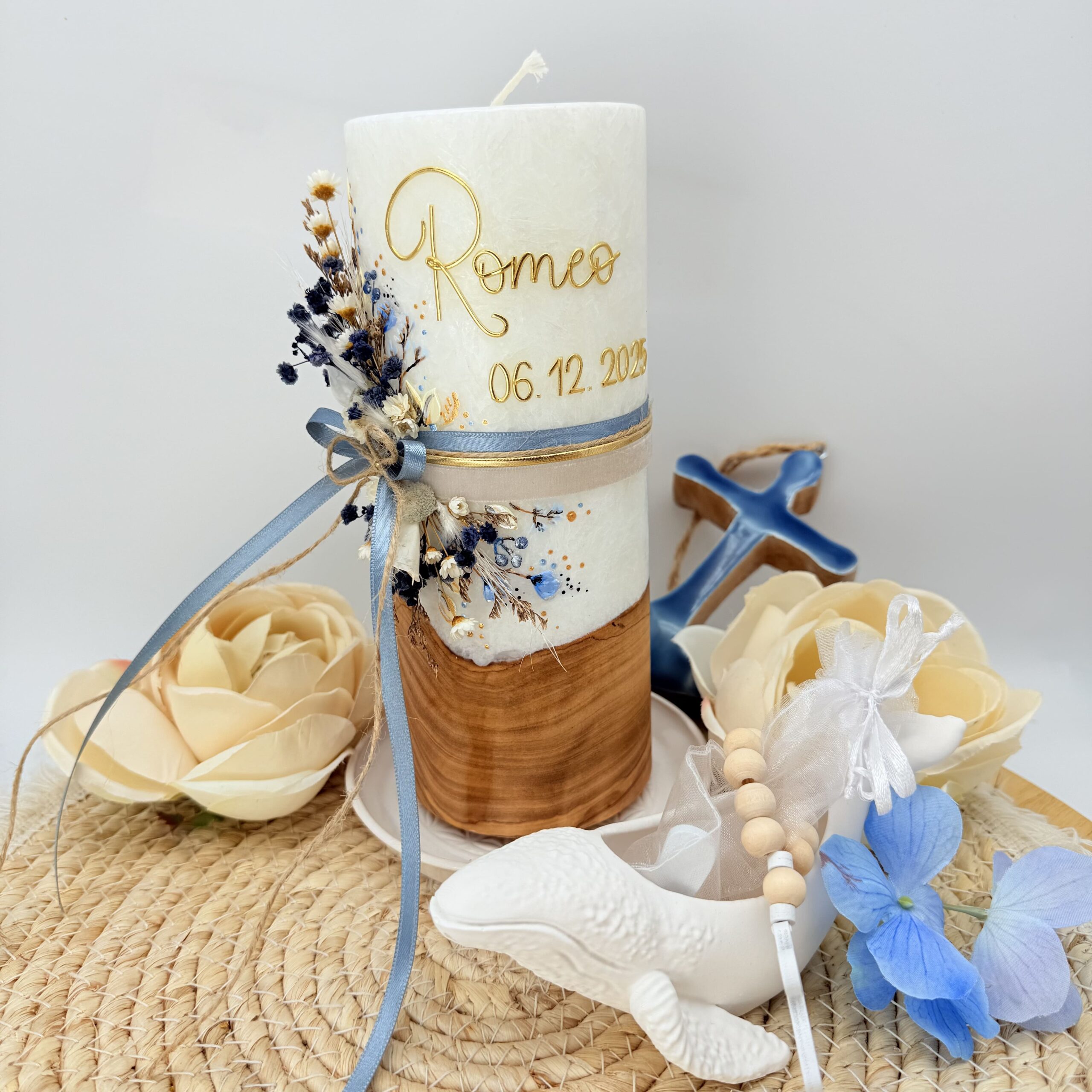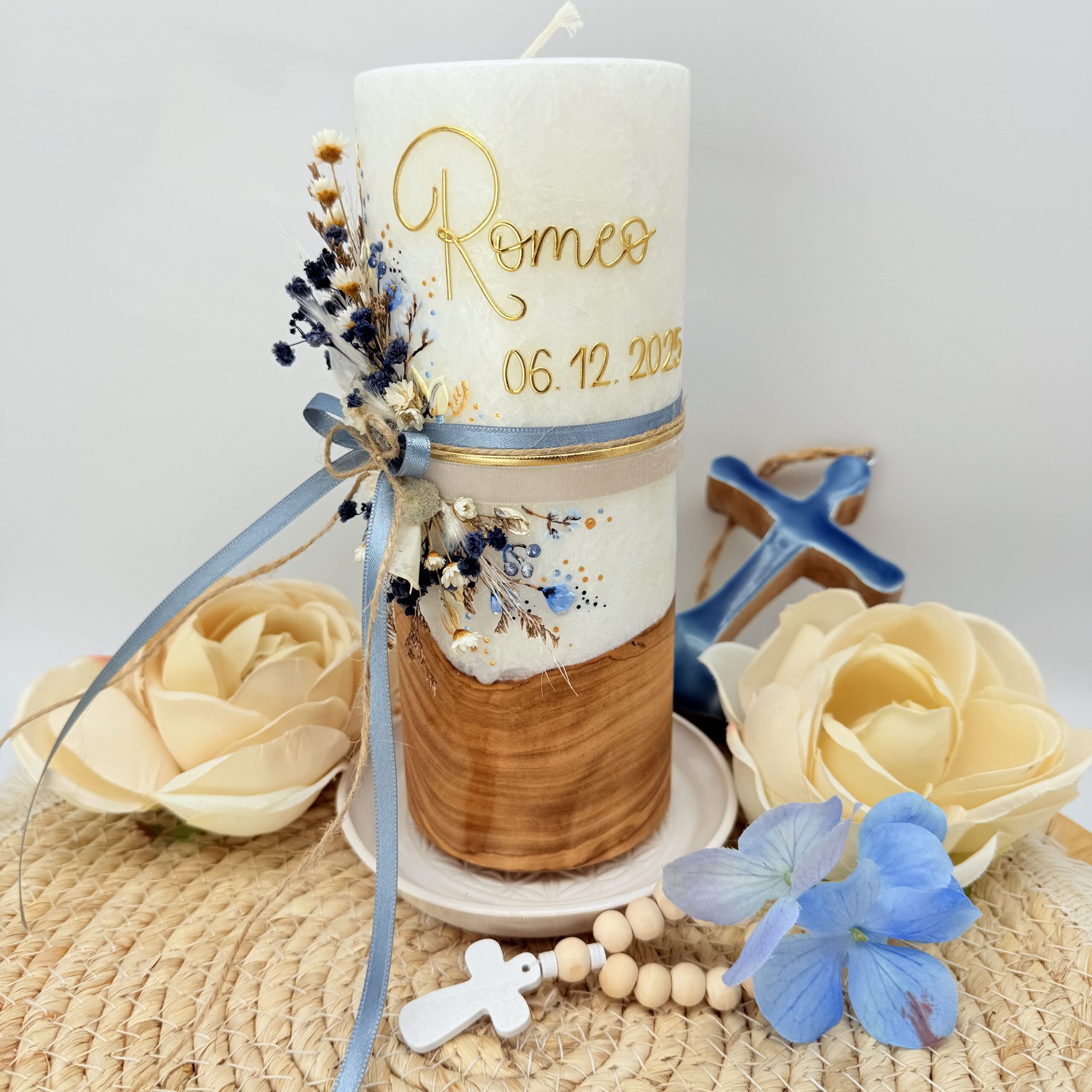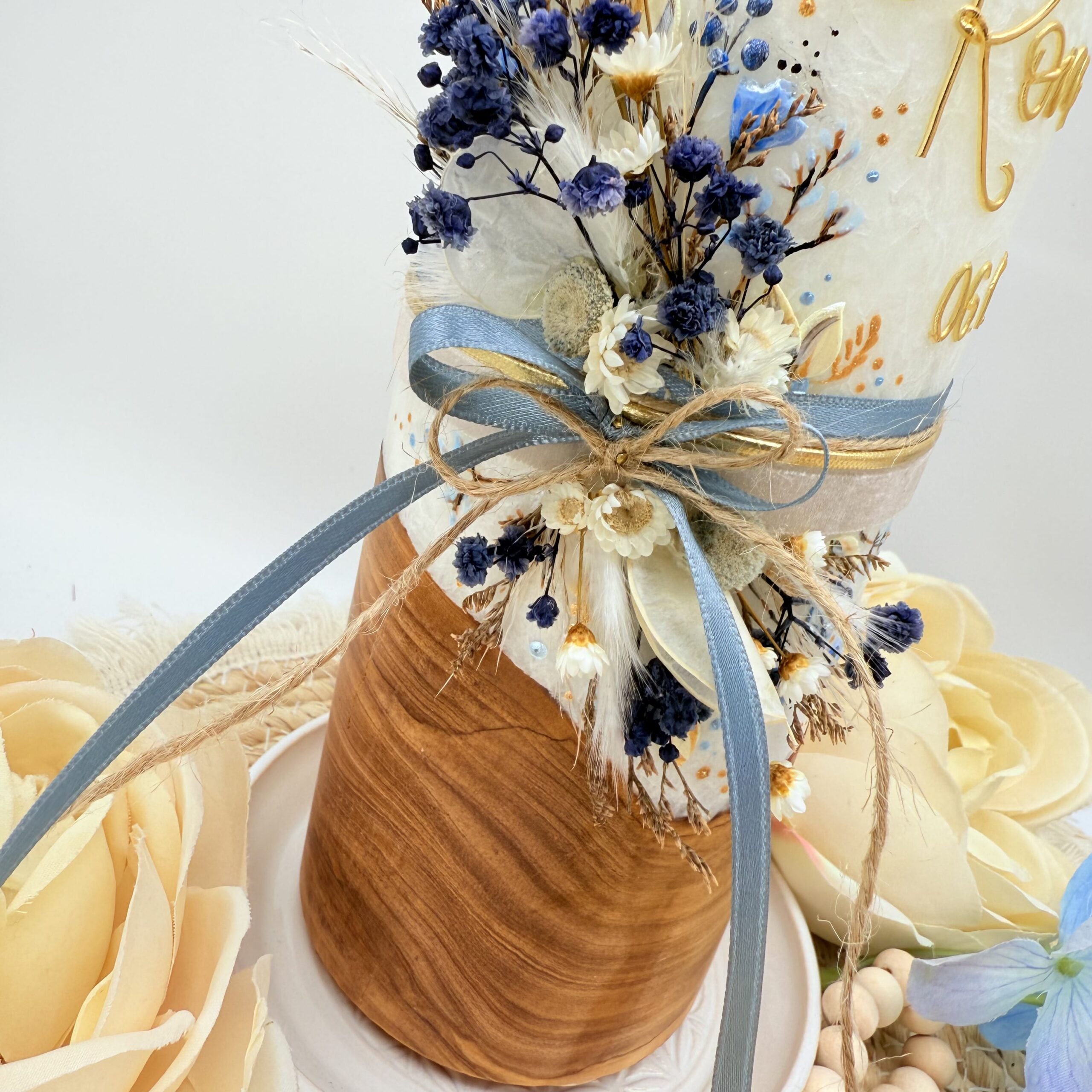 Wunderschöne Taufkerze aus Stearin mit eingegossenem Holzelement. Verziert wird diese Kerze mit verschiedenen Bändern, aus denen ein Blütenbüschel „wächst“.