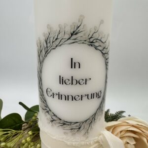 Trauerkerze mit zeitlosem Schleierkrautkranz und einem Spruch.