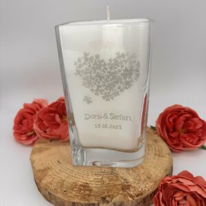 Da die Möglichkeiten schier unendlich sind, was Motive, Gläser und Gestaltungsmöglichkeiten angeht, haben wir keine fixen Modelle im Sortiment. Aber wir finden mit euch gemeinsam ganz bestimmt etwas, das genau eurern Vorstellungen entspricht! Die Gläser werden von uns mit hochwertigem Wachs und in Handarbeit befüllt. Die Kerze im Glas kann mit Blumenschmuck hervorragend in Szene gesetzt werden. Sie ist wiederbefüllbar und somit ein Leben lang euer Begleiter! Somit könnt ihr das Glas wahlweise als Kerze, Blumenvase, Dekoartikel, Windlicht und vieles mehr verwenden!